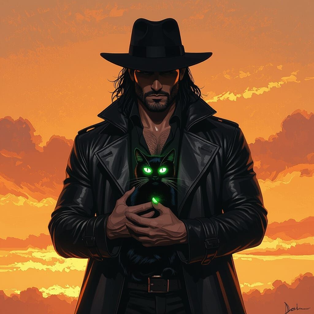 A dramatic image of a man in a trench coat silhouetted against a twilight sky, holding a glowing-eyed cat. The artwork employs painterly textures and cinematic lighting.