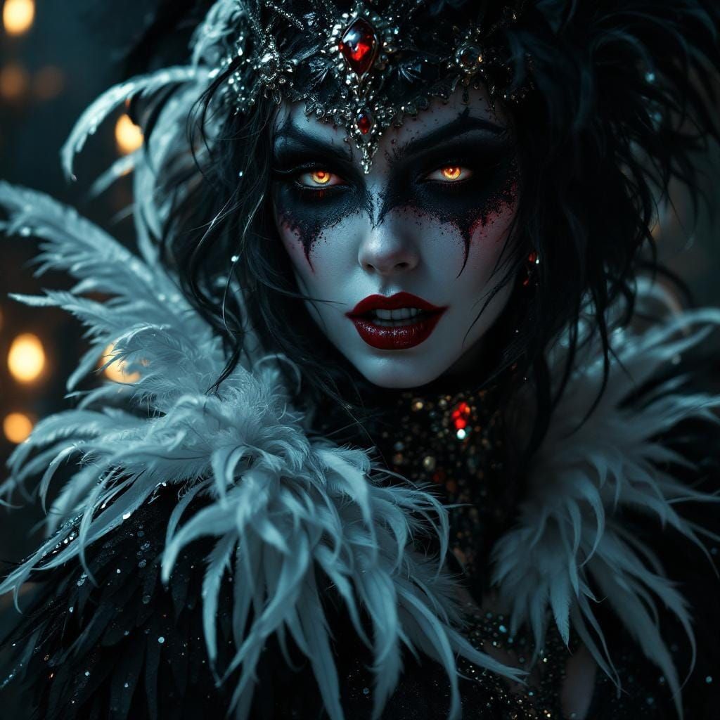 This image depicts a vampire showgirl in a dark and gothic setting. She is adorned with feathers and sequins, complete with fangs, embodying a grimdark aesthetic.