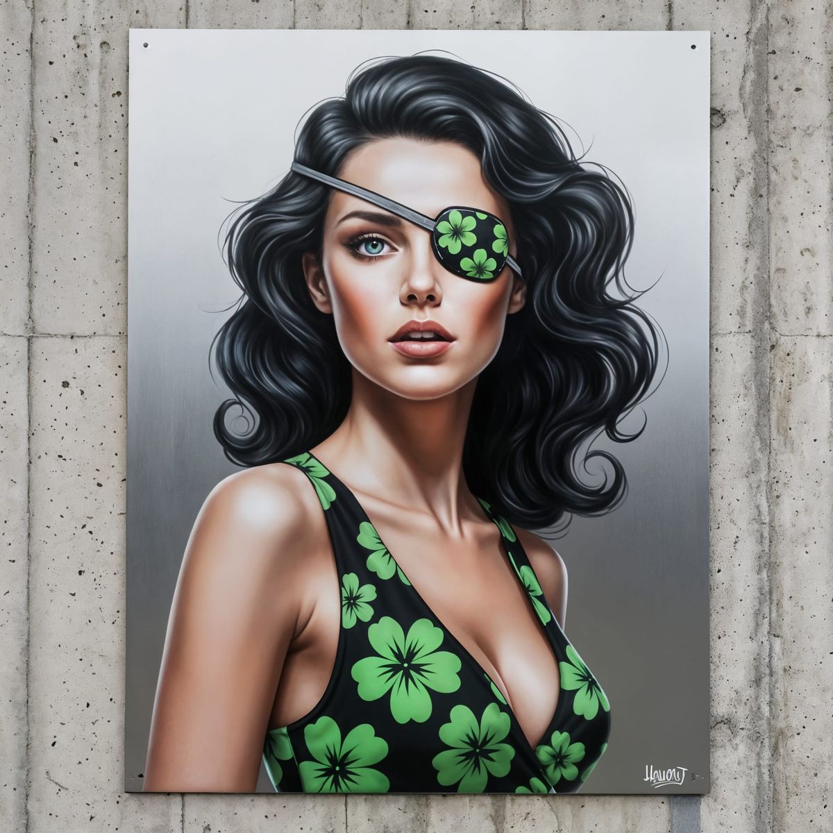 A street art portrait of a woman with an eyepatch and floral dress, spray-painted on metal affixed to a concrete wall. The artwork presents a dynamic viewpoint.