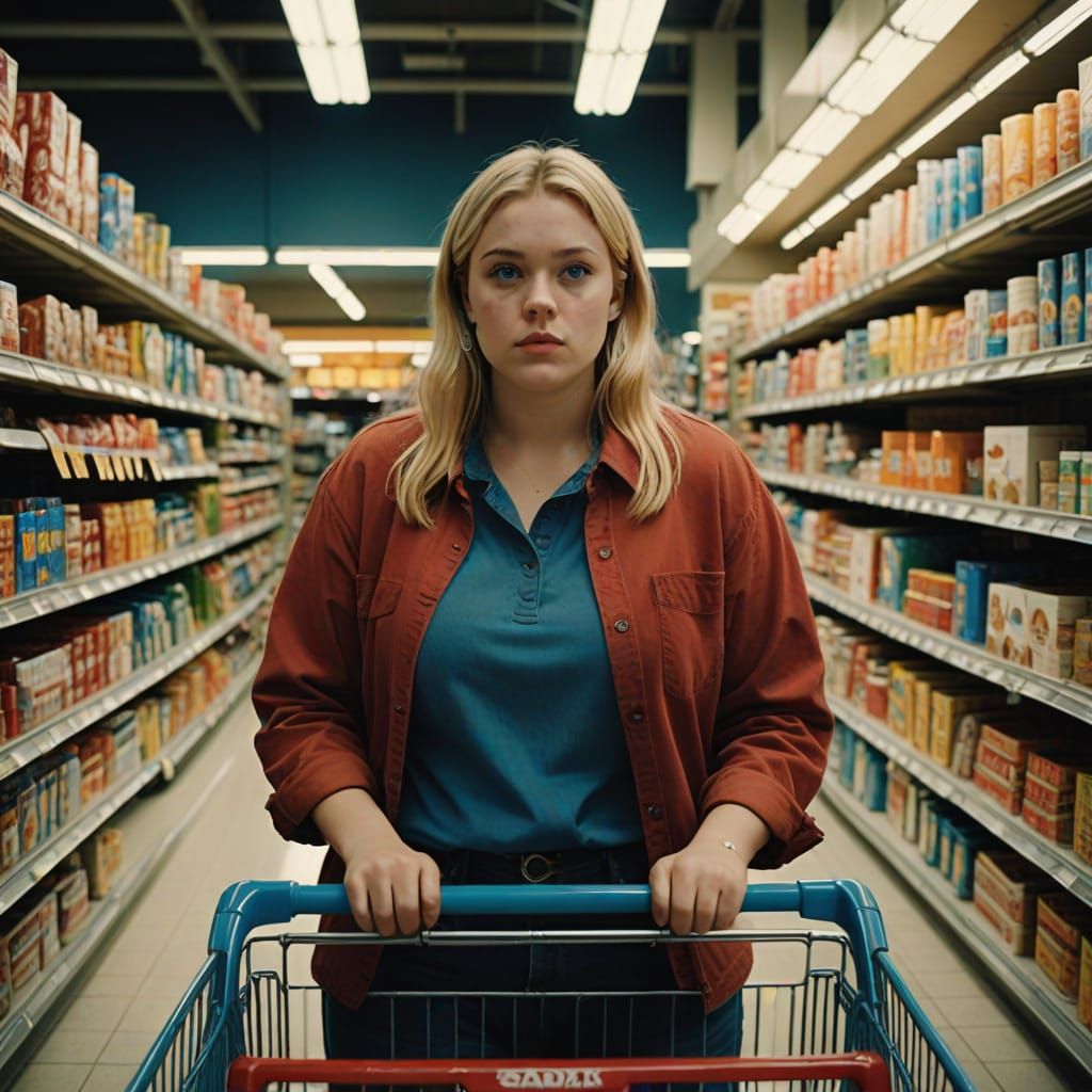 A stunning portrait of a woman with a chubby face, straight blonde hair, and blue eyes, captured in a cinematic film still with warm, golden lighting and rich colors.