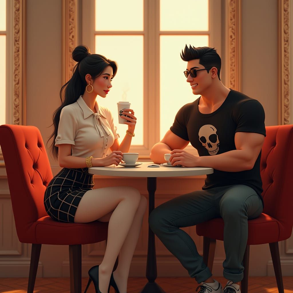 This image showcases a Japanese science teacher and an Irish man enjoying coffee at an elegant cafe. Rendered as 3D digital art with bright, cinematic lighting and a radial gradient background.