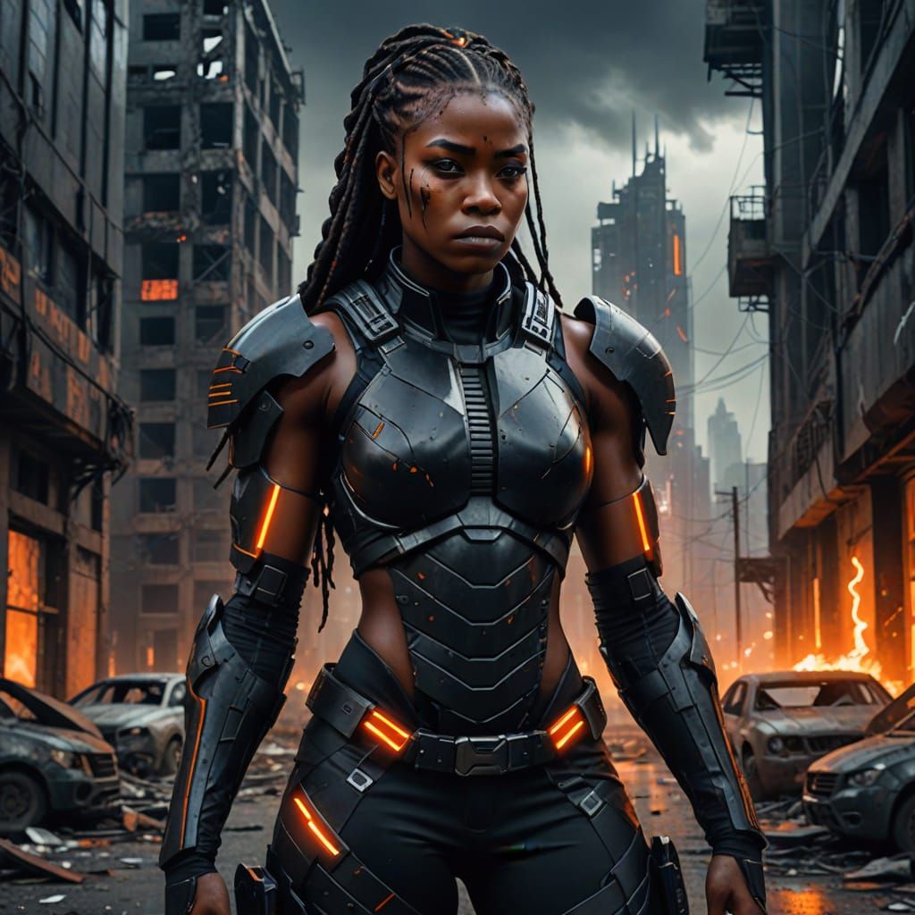 This image depicts a muscular, dark-skinned African woman in futuristic black armor. She stands in a ruined cityscape with a serious expression in a dark and gritty cyberpunk aesthetic.