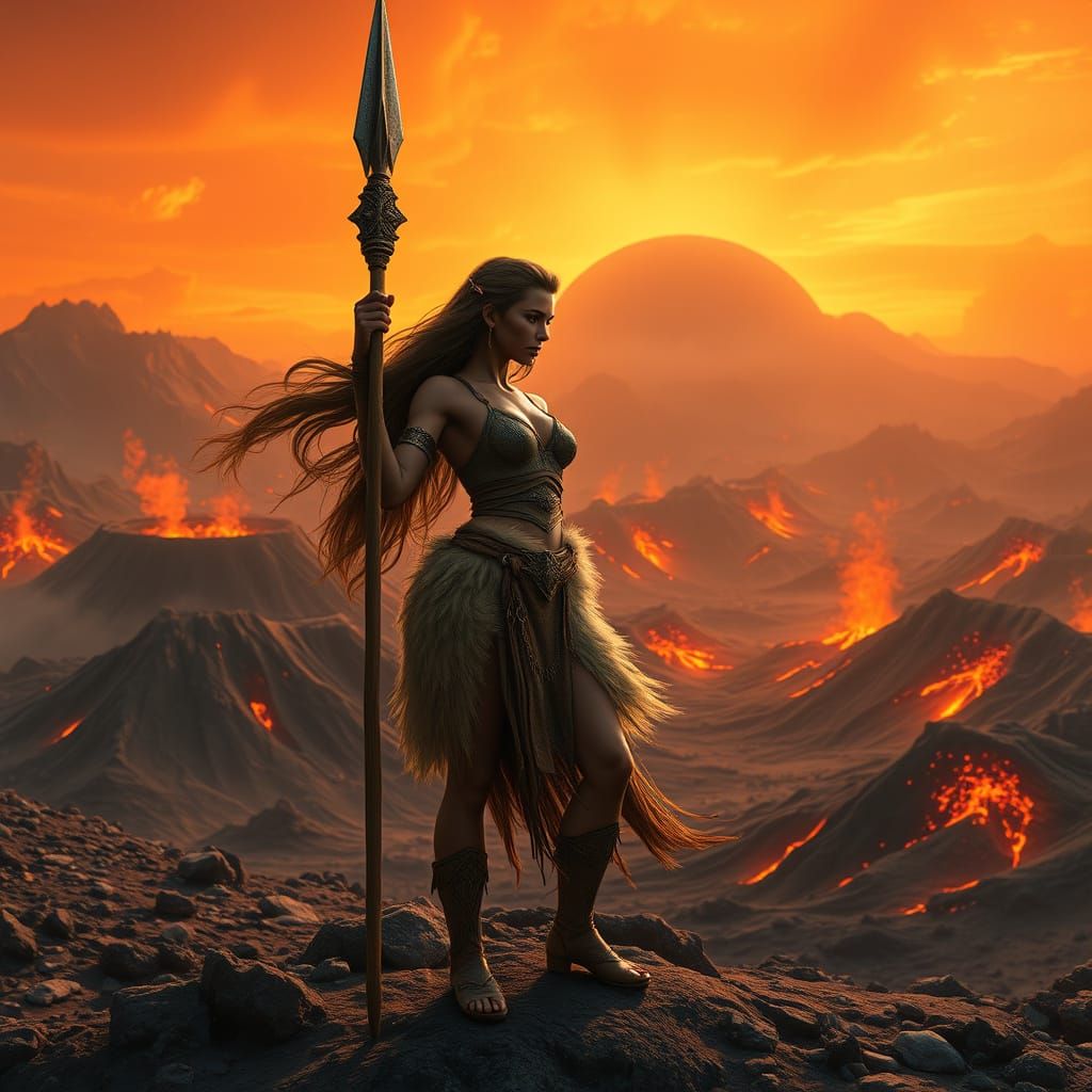 This image shows a fierce warrior on a volcanic alien planet. She is dressed in furs and ready for battle. The hyperrealistic image is rendered with dynamic lighting and intricate details in 8k resolution.