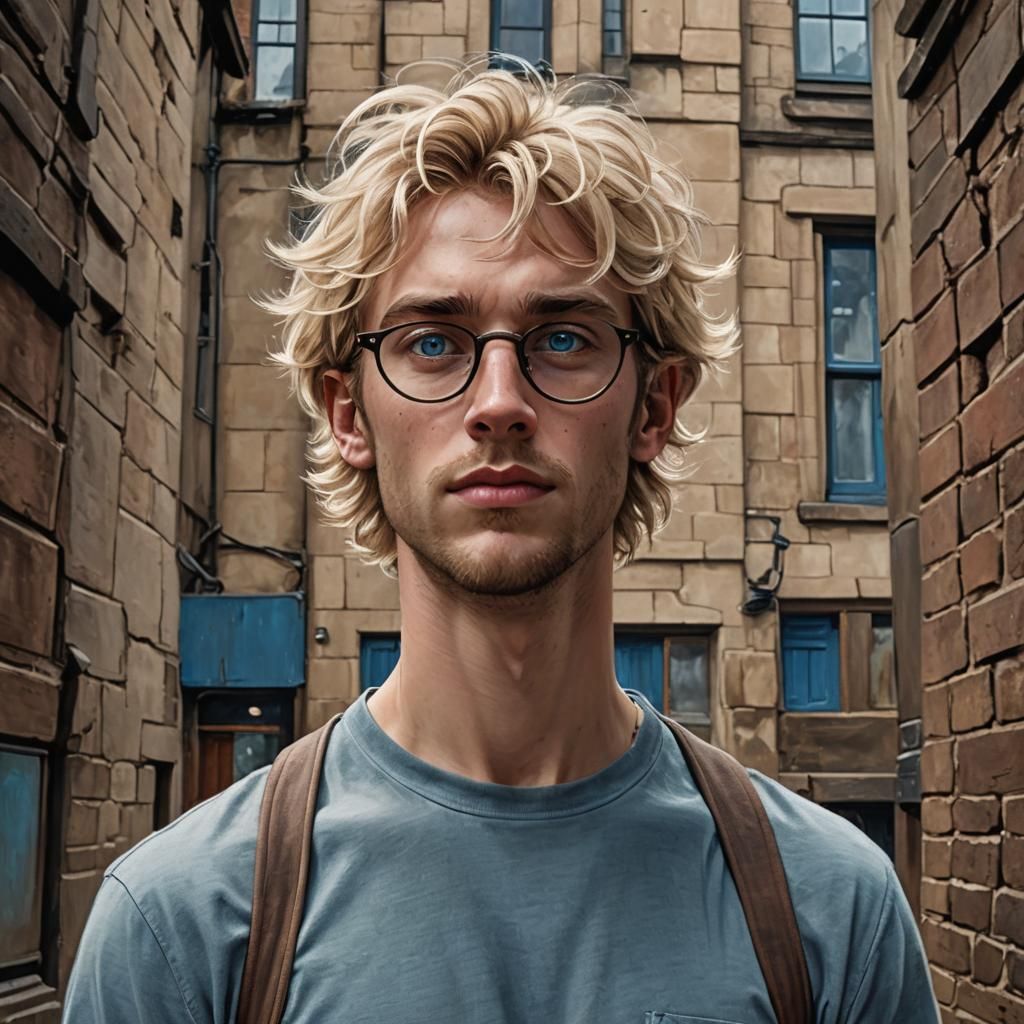 A realistic portrait of a blond, blue-eyed Welsh college student in his early twenties. The digital painting is rich in color and detail, rendered in 8k resolution.