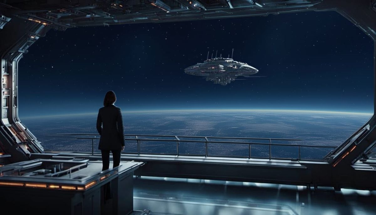 This image shows a dramatic, detailed view from a space station lounge as a young woman observes a colony spaceship leaving. Evokes a sense of epic scale and atmosphere.