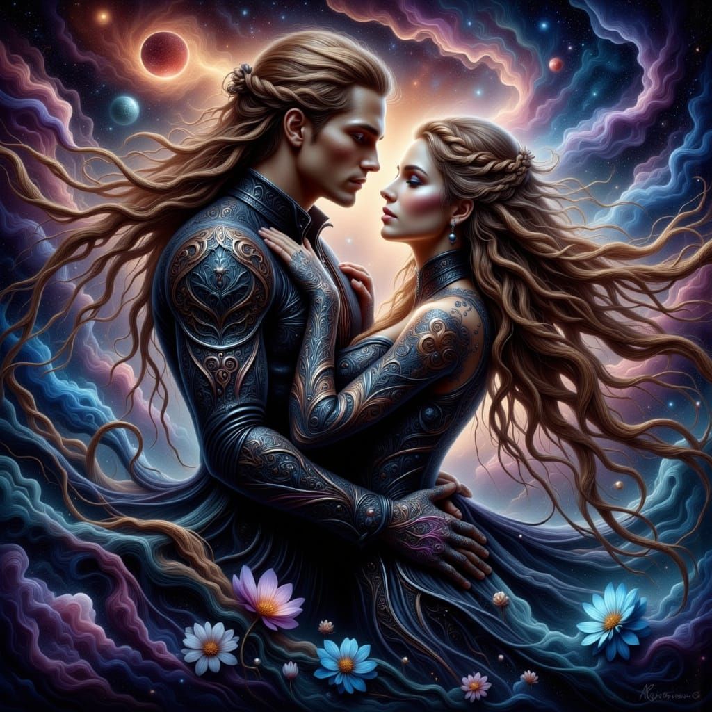 This image depicts a couple in gothic leather attire against a backdrop of swirling opal nebulae. The woman has striking blue eyes and pink-tipped hair, with intricate henna tattoos visible.