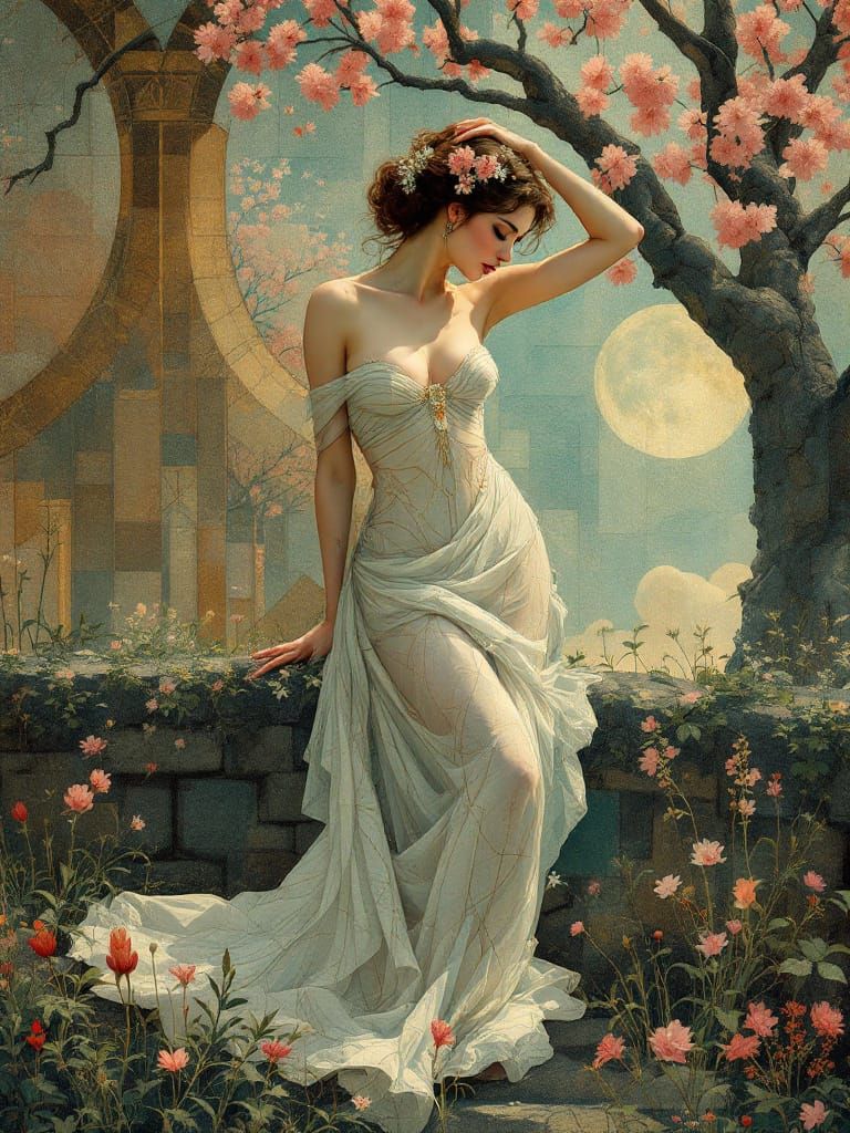 This image blends Art Nouveau elegance with vintage pin-up charm against an abstract garden backdrop. Featuring geometric patterns and cherry blossoms in pearlescent pastels, it offers a dreamlike, refined aesthetic.