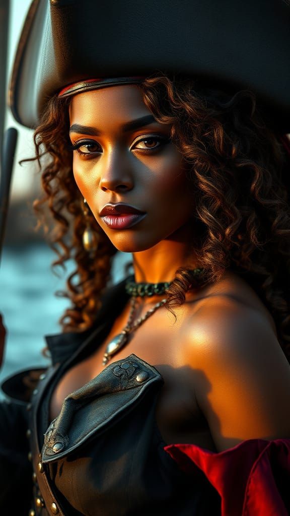 A hyperrealistic image of a beautiful African pirate woman with curly hair and a hat, striking an alluring pose. Photorealistic style with cinematic lighting.