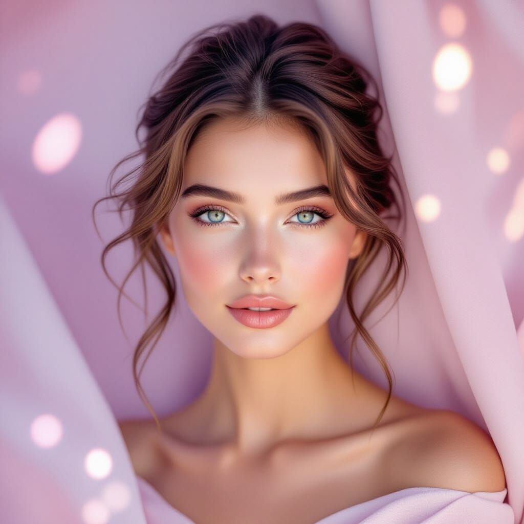 This image shows a beautiful young woman with fair skin, set against a soft pastel background. The dreamy, romantic image is photorealistic with smooth lighting and fabrics.