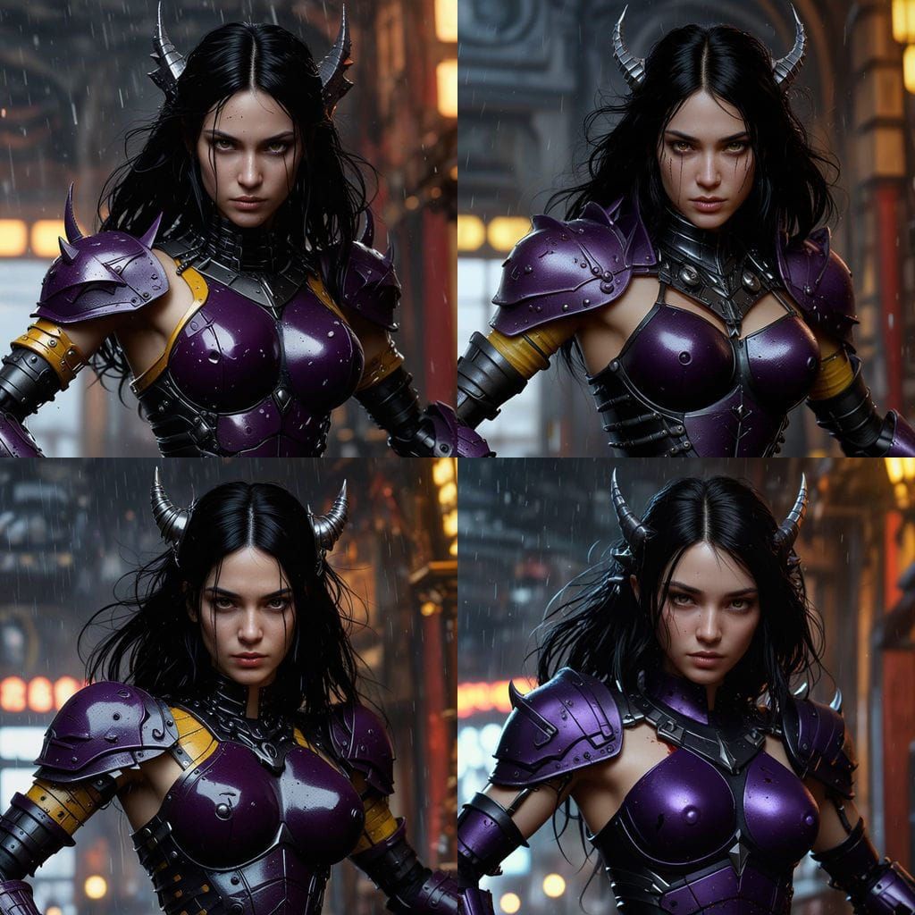 A striking picture of a dark fantasy goddess with black hair, emerging from a cyberpunk storm filled with robot blood, dragon claws, and razorwire, set against a backdrop of dynamic lighting and deep, complementary colours.