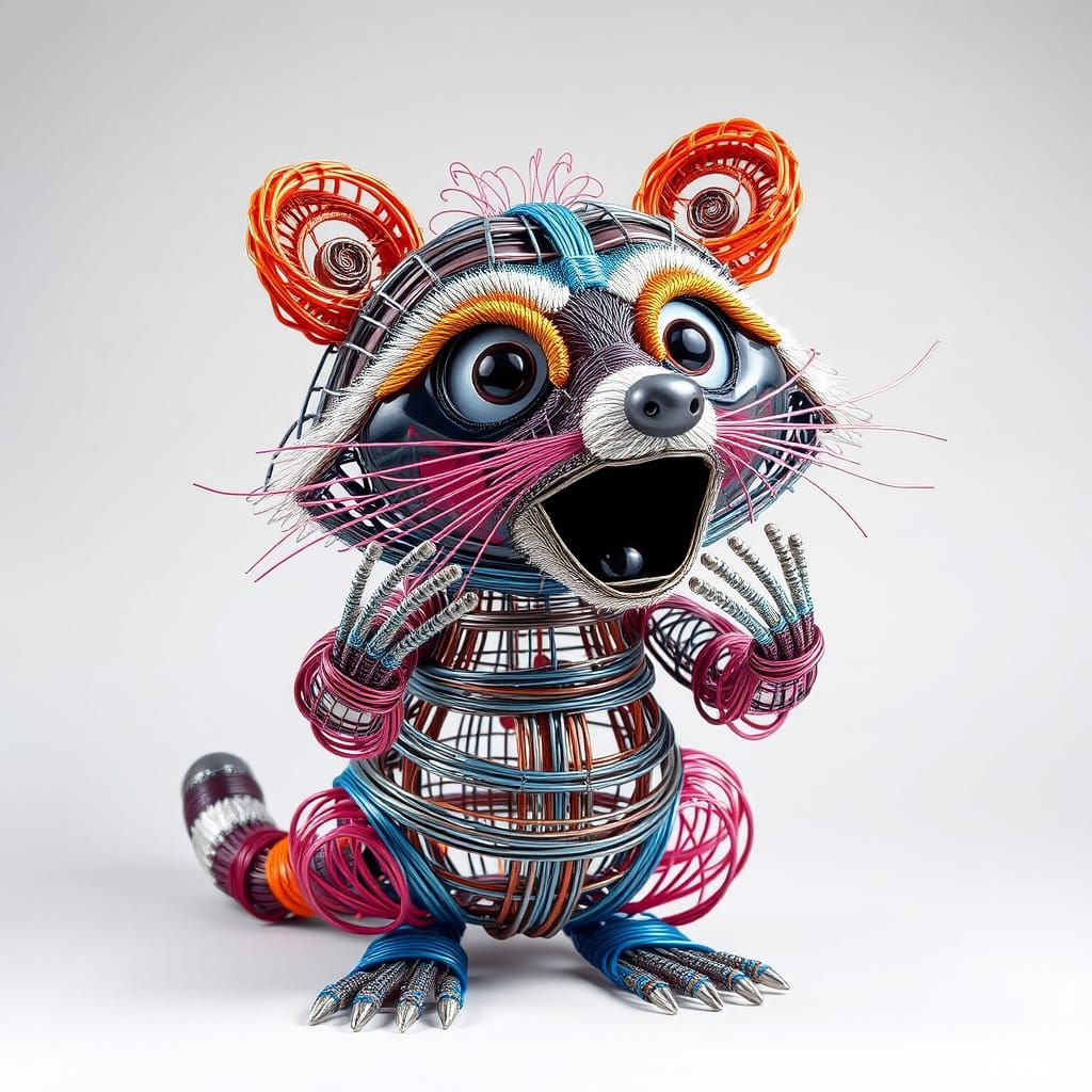 This image shows a vibrant wire sculpture of a surprised raccoon. The abstract artwork uses layered loops and spirals to create an expressive, dynamic design with reflective metal textures.