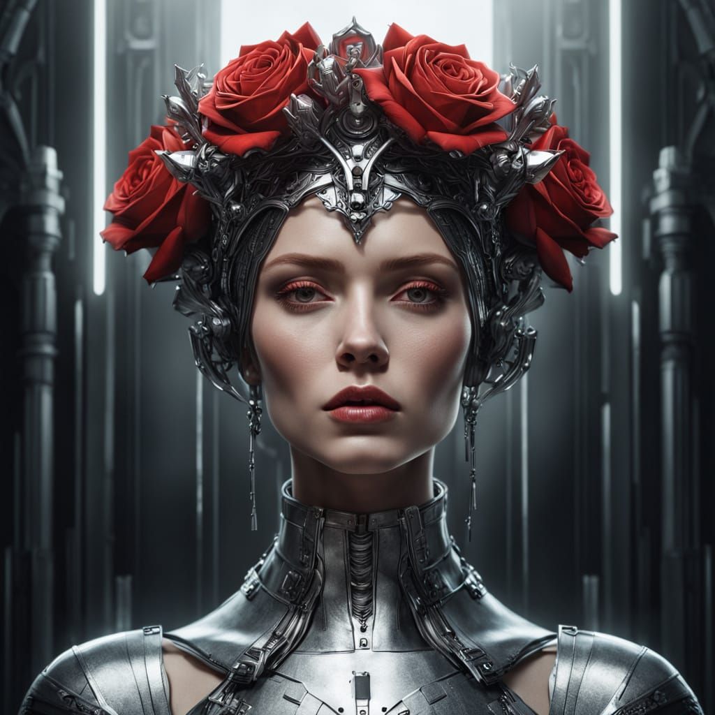 This image shows a hyper-realistic portrait of a woman with a crown of roses, seamlessly transitioning into android plating. The artwork blends gothic and futuristic elements with dramatic lighting and intricate details.