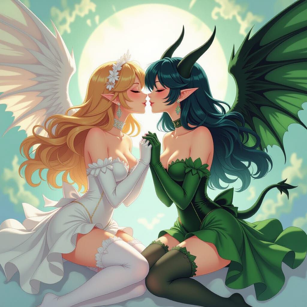 This image shows two Digimon women, one angelic and one demonic, sharing a kiss. Soft pastel colors and deep tones create a dreamlike quality, inspired by romantic and ethereal art.