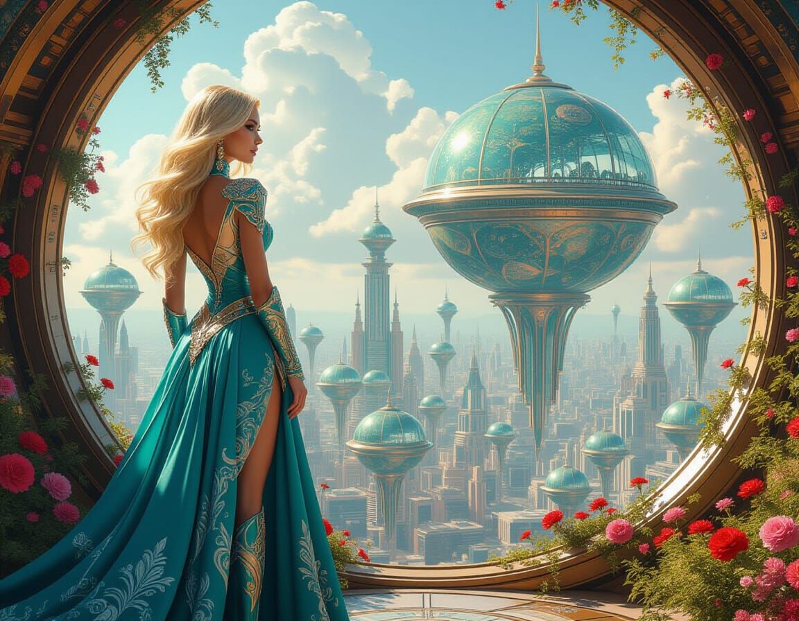 This image shows a beautiful blonde woman in a futuristic costume, posed in front of a sprawling cityscape filled with flowers and greenery. The maximalist style features intricate details and a vibrant color palette, with geometric patterns.
