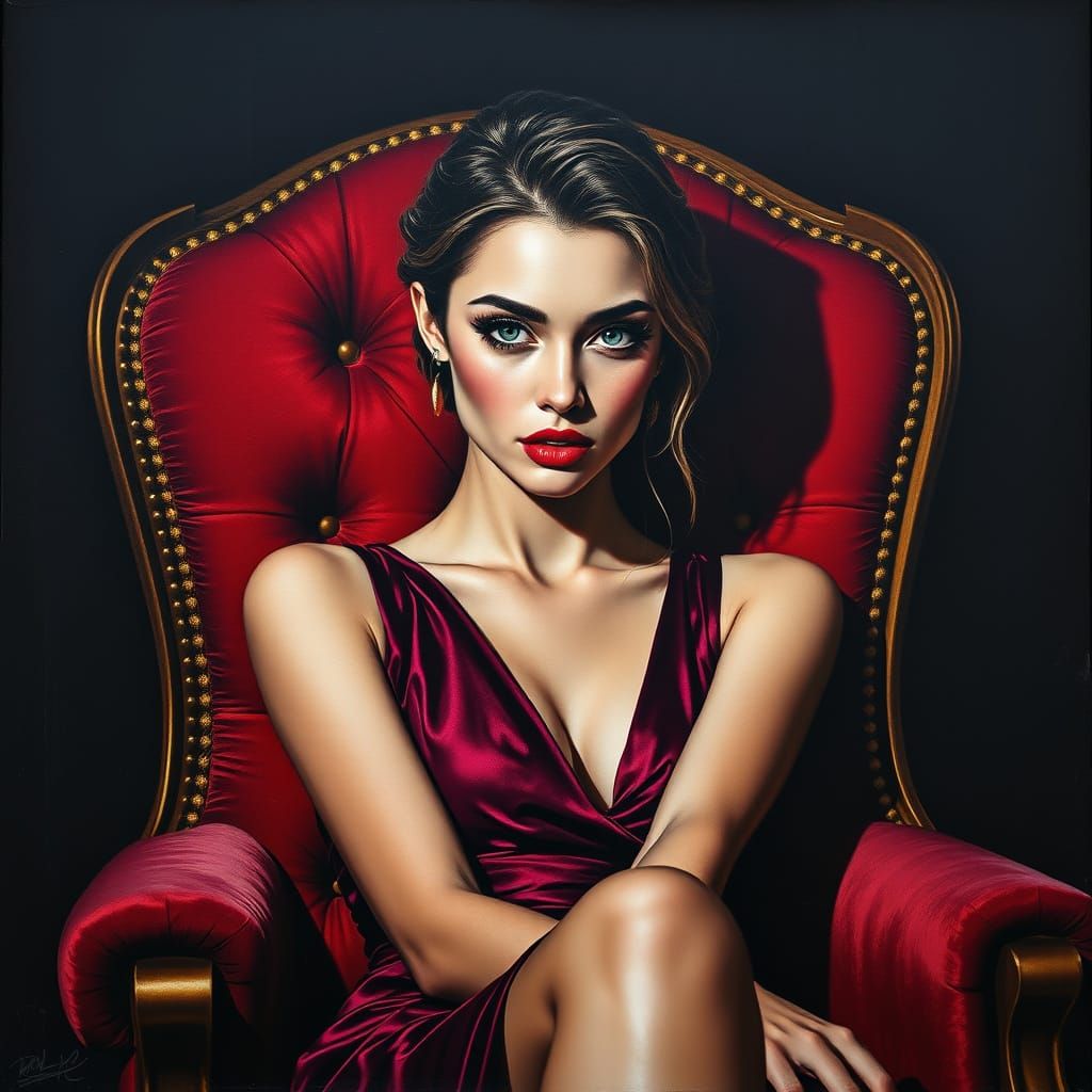 This hyperpop spray art style image features a young woman with delicate features and green eyes in a burgundy dress. Moody lighting and dark shadows create an intimate, mysterious atmosphere.