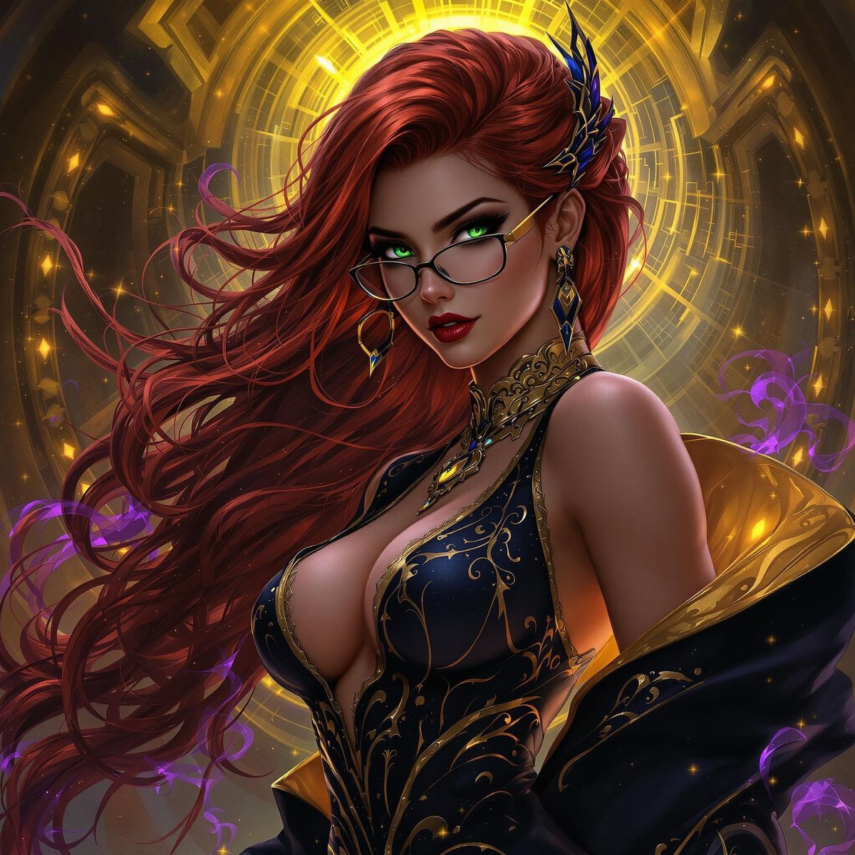 A stunning image of a muscular, red-haired woman with glasses in a dark fantasy setting. The artwork features dynamic lighting, rich colors, and hyperdetailed textures as splash screen art.