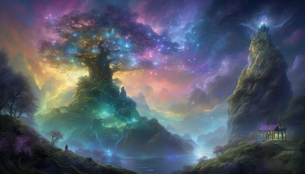 A surreal image shows a crystalline tree dominating a floating island. The roots emit light into an abyss below, while branches reach towards galaxies. Ancient ruins and a cloaked wizard complete this detailed, ethereal vista with holographic lighting.