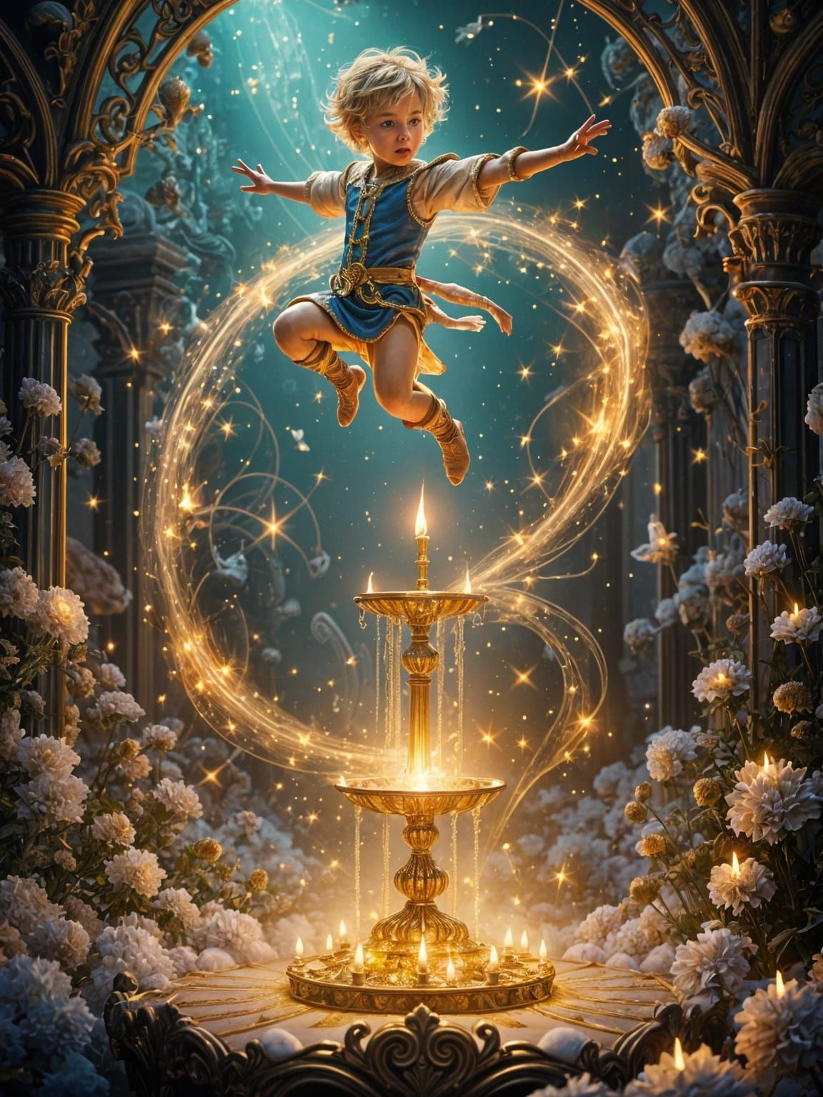 A young wizard named Jack performs a magical leap over a glowing candlestick, surrounded by swirling golden magic, floating lights, and enchanted objects. Vibrant storybook fantasy art.