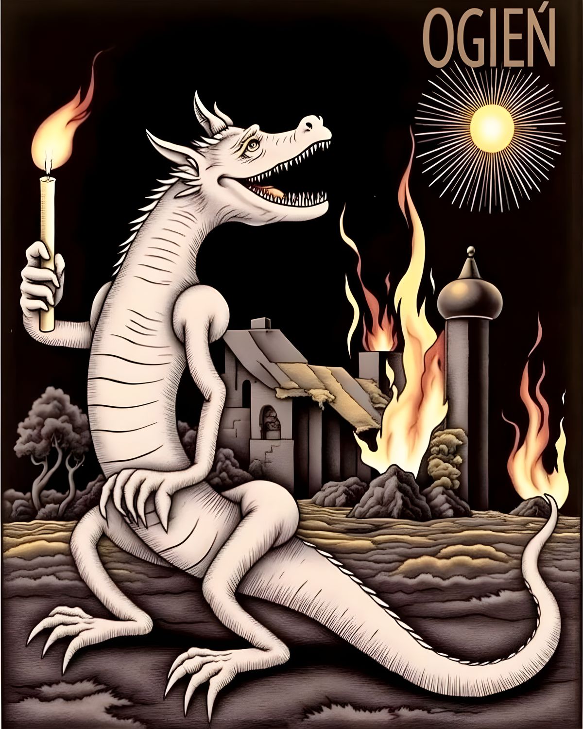 This image depicts a humorous, surreal candle dragon breathing fire in the distinctive style of 1930s cartoons, reminiscent of Fleischer Studios.