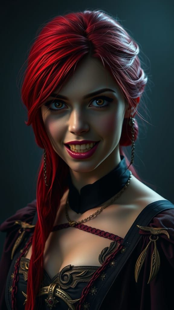 This image shows a photorealistic portrait of a red-haired, 22-year-old woman with fangs in a dark medieval setting. The arrogant-looking woman is wearing a gown and averts her gaze.