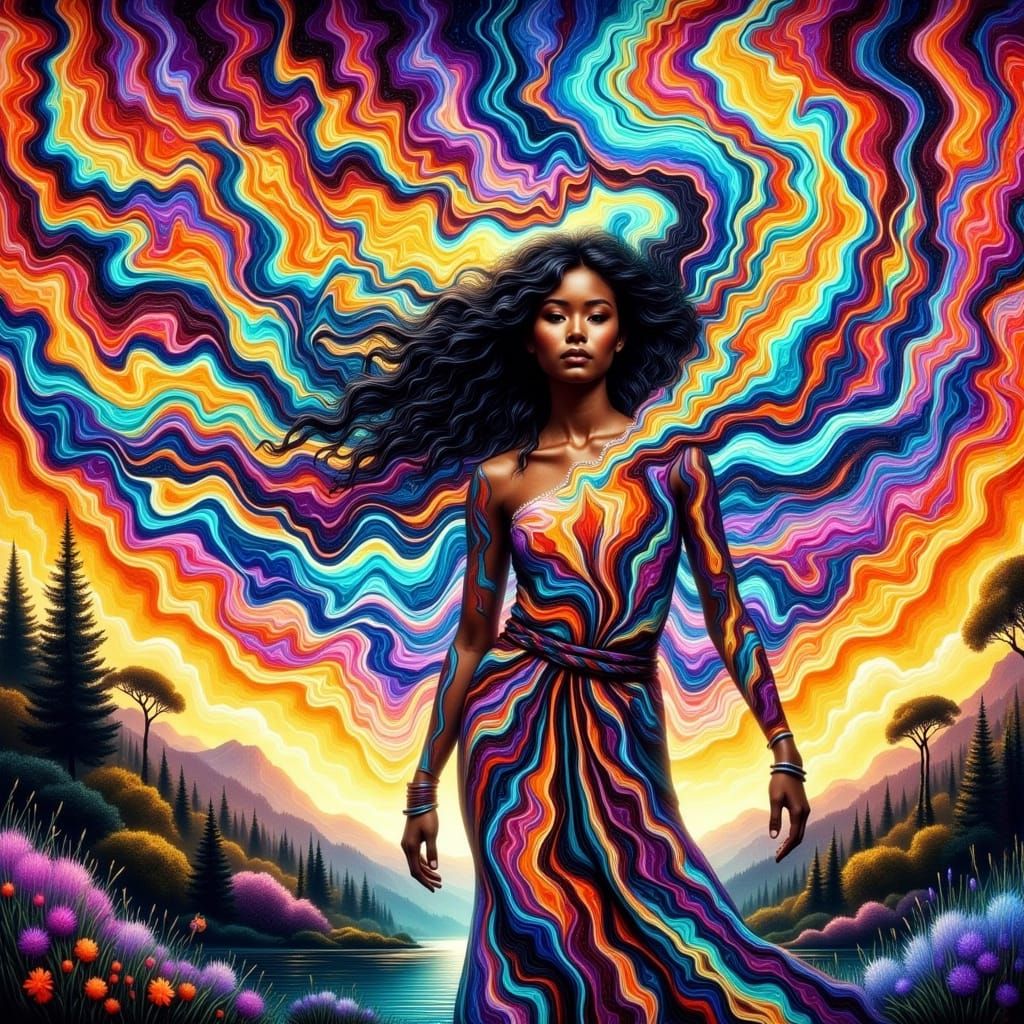 This image showcases a proud Indigenous Australian trans woman in a surreal, dreamlike environment, with shimmering, morphing skin reminiscent of traditional Aboriginal artwork, blending vibrant colors and patterns in a breathtaking, psychedelic display