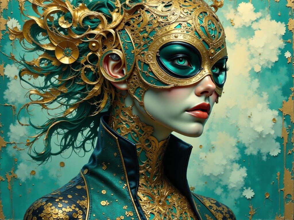 This image showcases a steampunk gentleman with intricate details and glowing elements, set against a Celtic pattern background. Features bright, contrasted colors with milky tones.