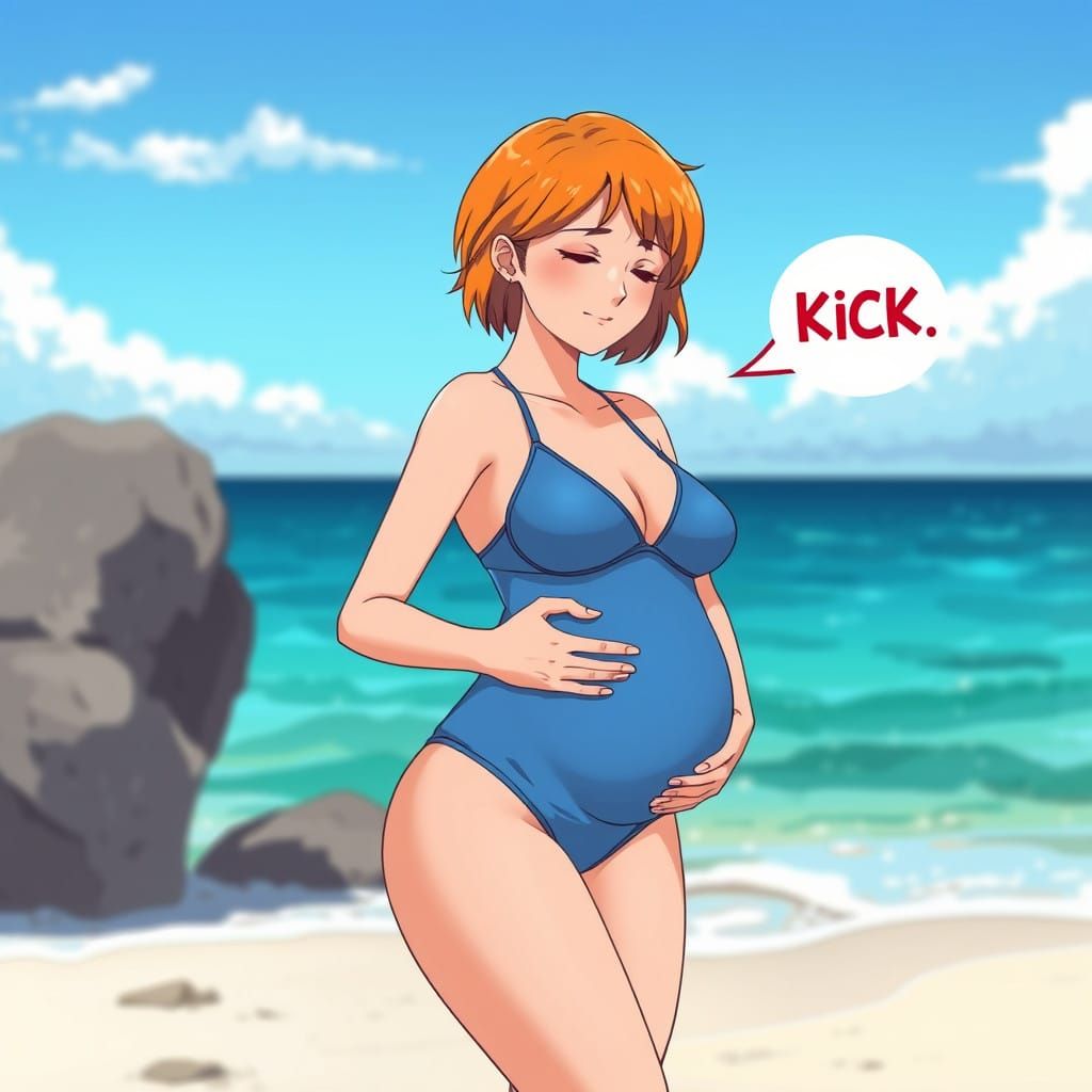 This image shows a pregnant anime character with short orange hair and a blue swimsuit, standing on a beach while feeling her baby kick. The scene is depicted in a vibrant, flat style with anime-inspired lighting.