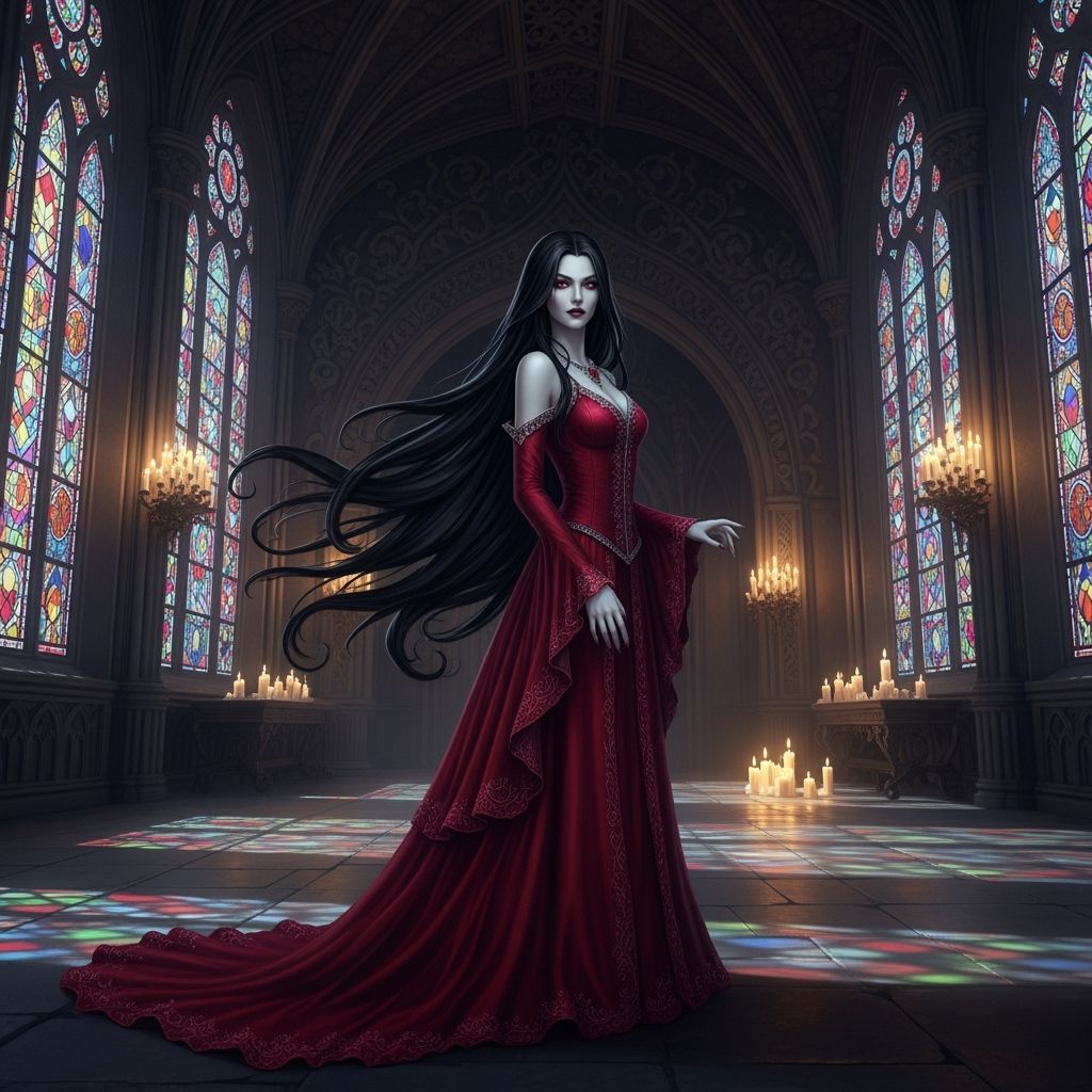 This image shows a gothic vampire queen in a crimson gown, standing in a grand hall illuminated by candlelight. The artwork evokes Victorian elegance with dark, mystical undertones.
