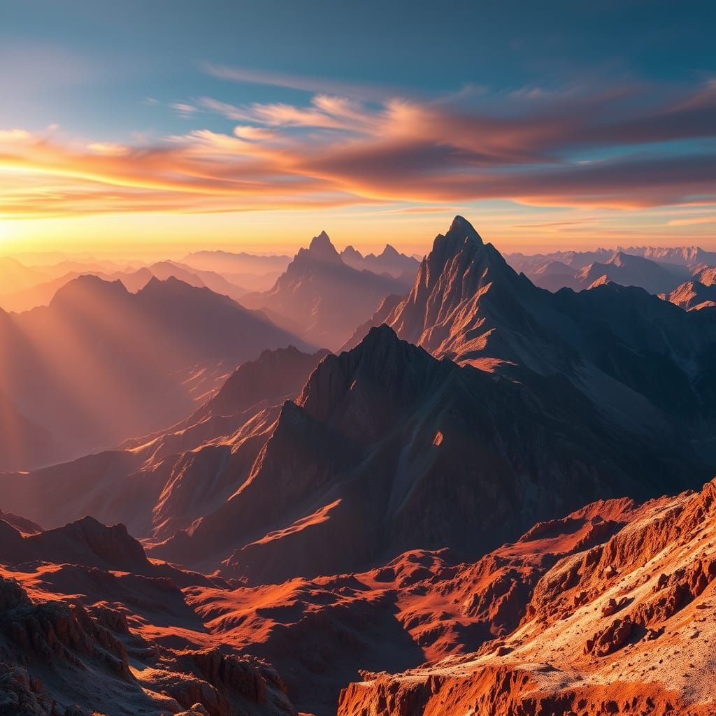 This image shows a breathtaking mountain landscape at sunset, with rugged peaks and vibrant colors, evoking the sense of a photorealistic masterpiece with intricate details and textures, inspired by hyperrealistic landscape photography