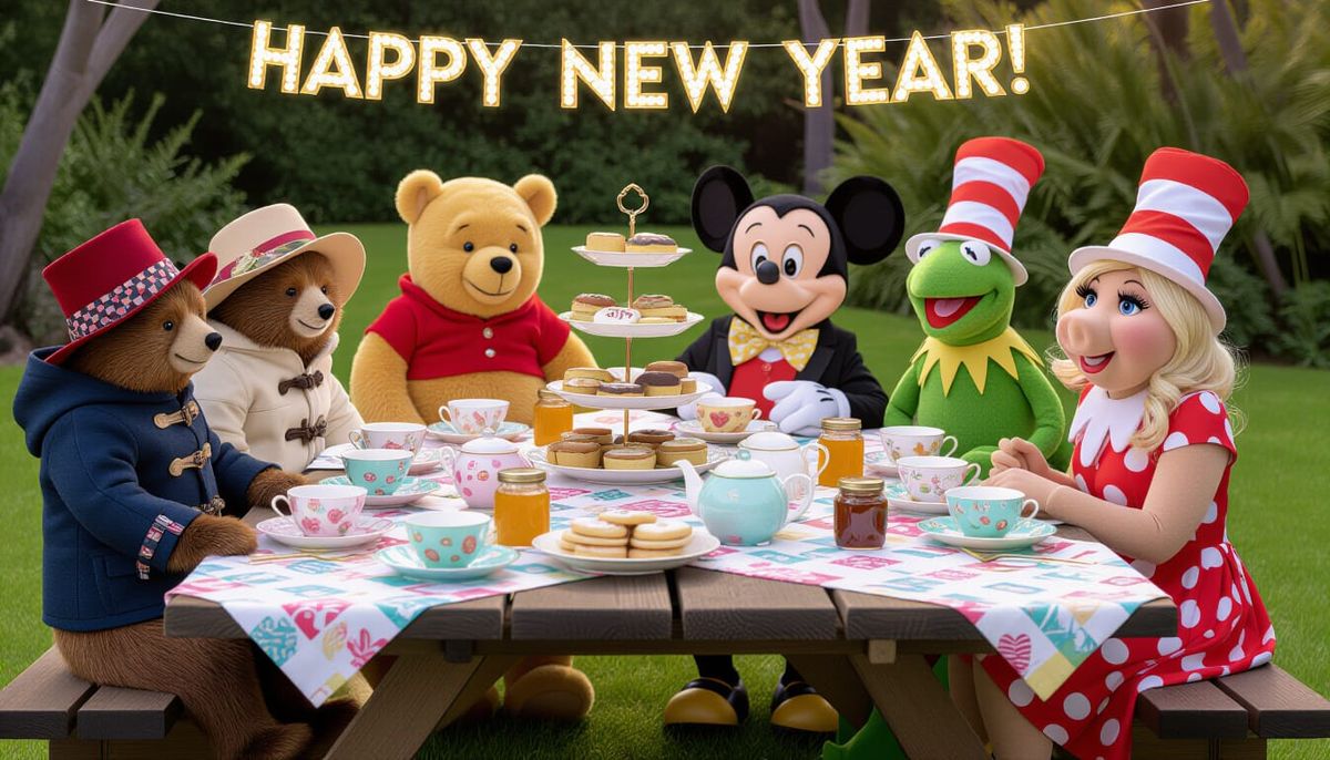This ultra-realistic photo captures a magical New Year's Eve tea party featuring Paddington, Pooh, Mickey, and more. A wooden table overflows with treats, set in golden hour light with a shallow depth of field.