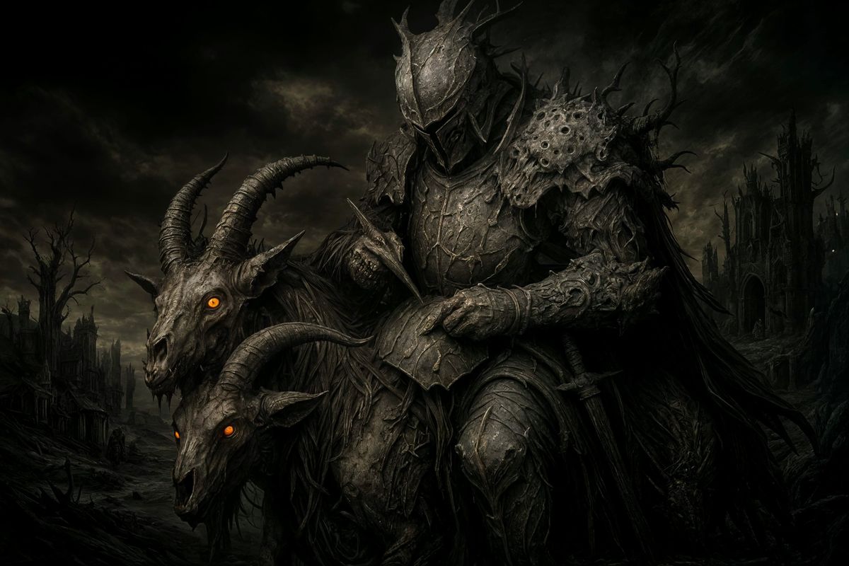 This image shows a Carrion Knight on a skeletal, two-headed goat, meticulously carving runes onto dark metal armor. The artwork is rendered in a gritty, gothic, dark fantasy style.