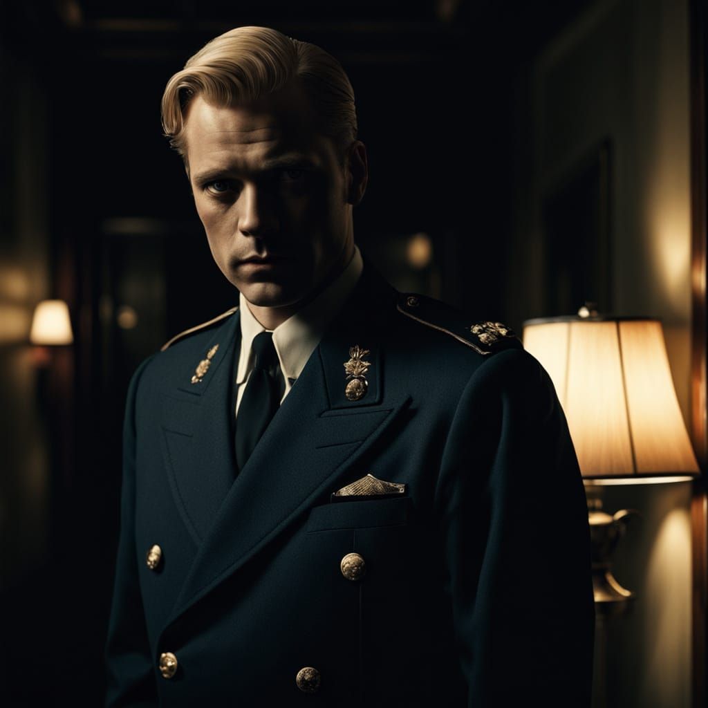 This image shows a blond doorman with blue eyes in a 1940s hotel lobby. The scene is lit with high contrast lighting and moody shadows, in a film noir aesthetic.