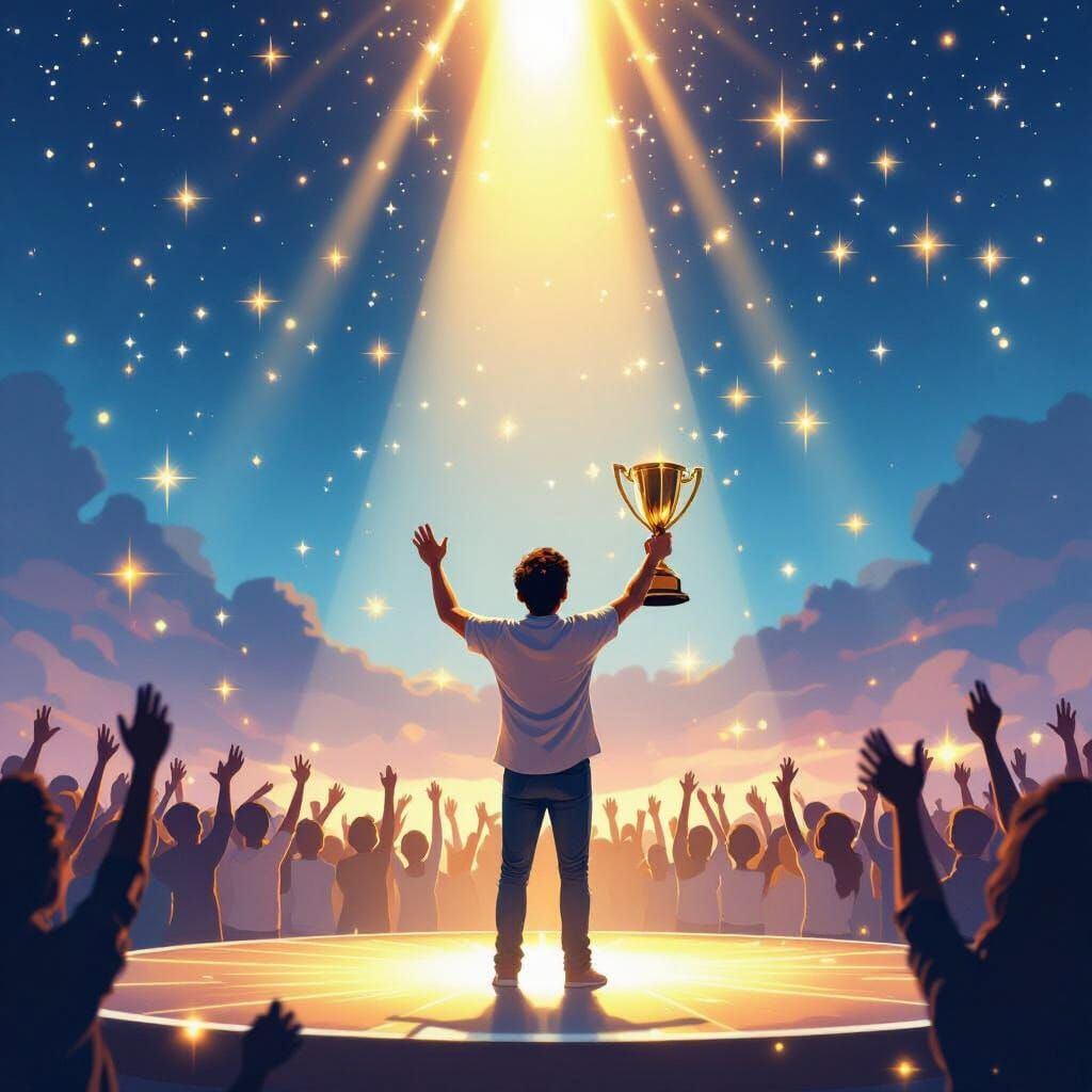 This image shows a person holding a trophy on a brightly lit stage, cheered on by a crowd beneath a starry sky. The scene is rendered in a vibrant, cinematic 3D style.