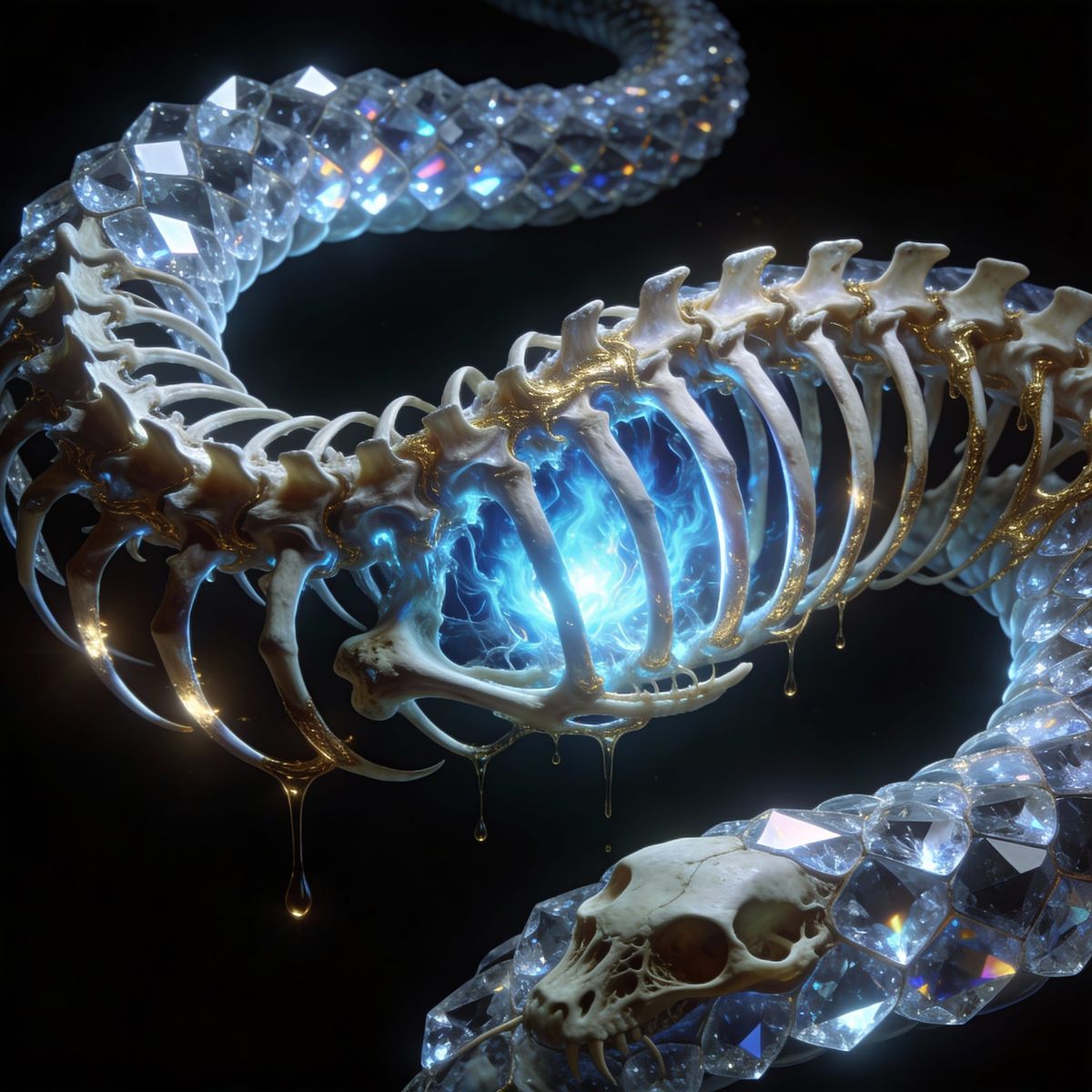 This image depicts a skeletal snake with shimmering crystal scales, its soul burning with intense blue fire and gold dripping along its bones. Created in a concept art style with dramatic lighting.