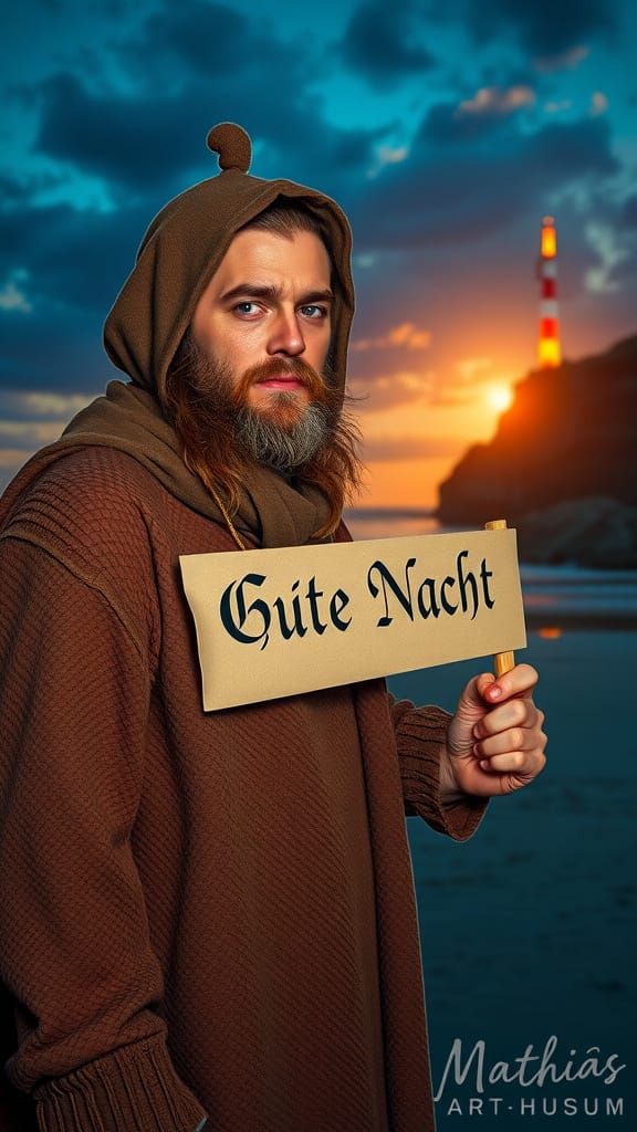 This image shows a man with a long brown beard and straw hat holding a torch and sign on a beach at sunset. A lighthouse stands in the background in photorealistic style.