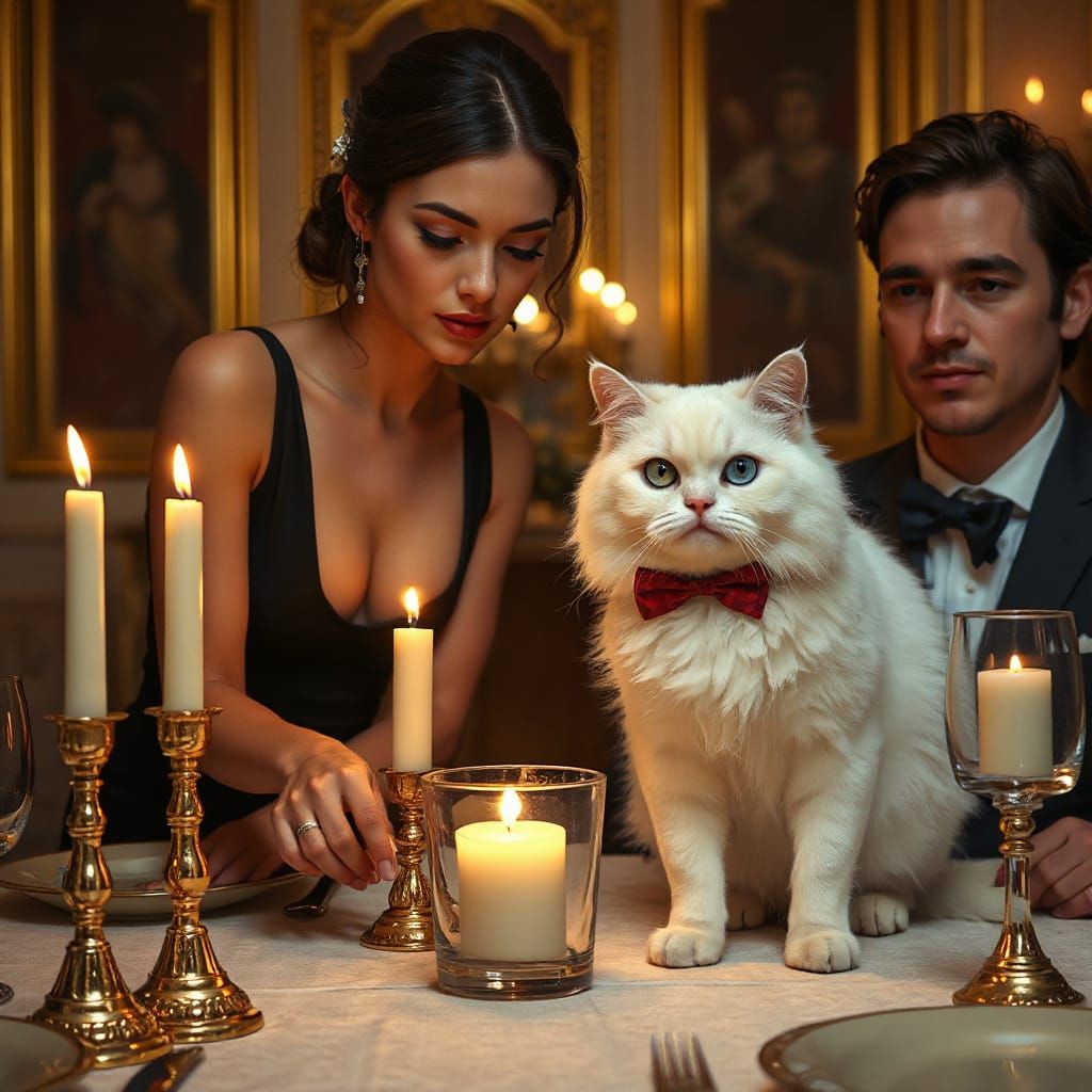 This captivating image shows a stunning woman in a beautiful evening gown, leaning forward to light candles on a lavish dinner table, while a territorial cat with bright blue eyes watches over her, creating a humorous and romantic scene.