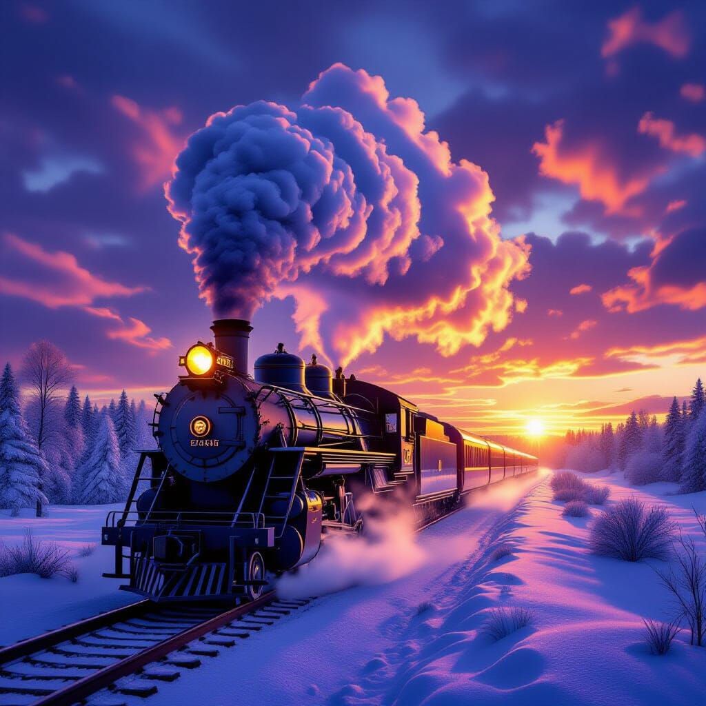A hyper-detailed steam train with brass accents travels snowy tracks under dramatic, atmospheric clouds glowing with sunrise colors. Photorealistic, HDR, cinematic lighting.