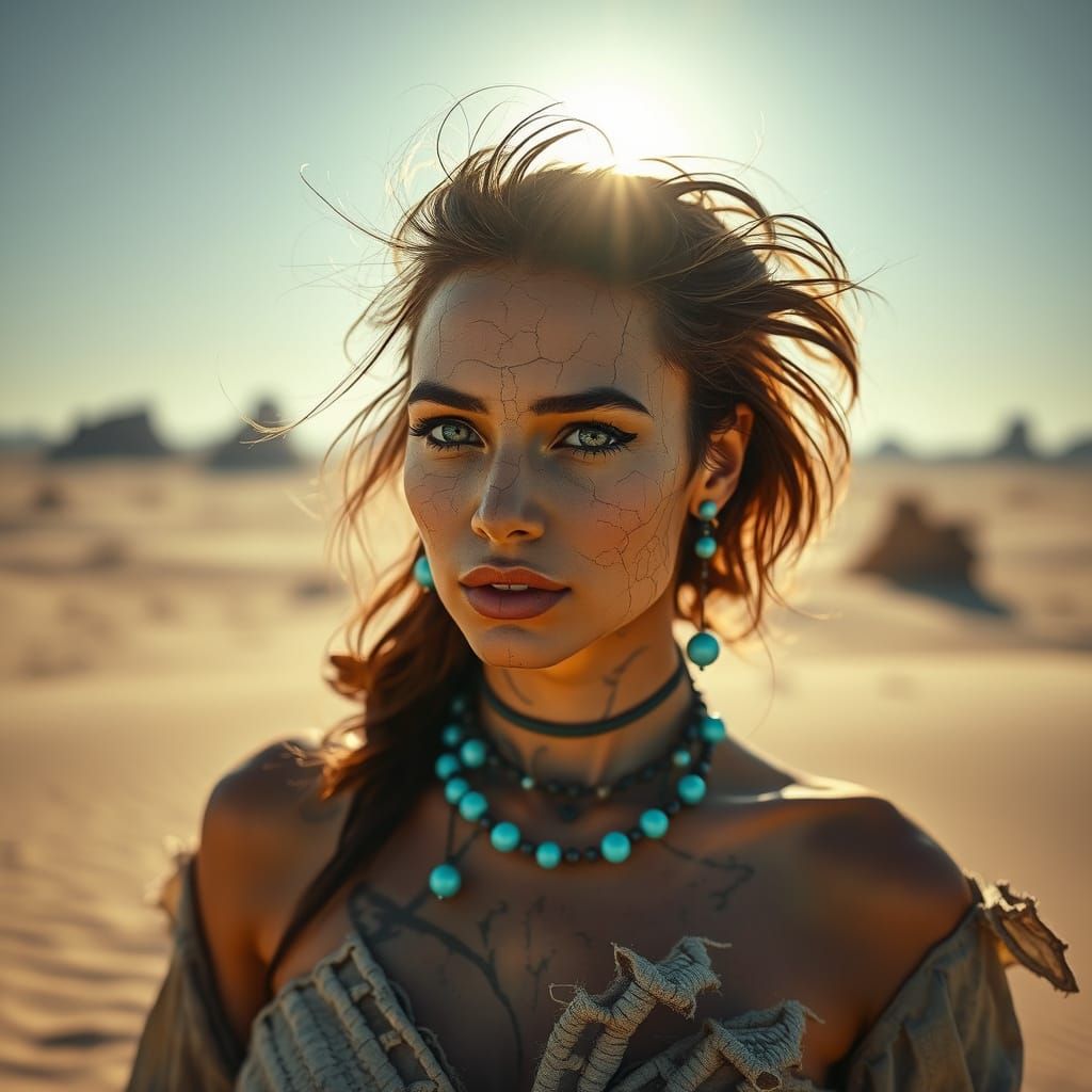 This image showcases a woman with copper skin, turquoise pearls, and futuristic blue runes, set against a blurred desert background. Her retro hairstyle and flowing, asymmetrical outfit add to the surreal atmosphere.