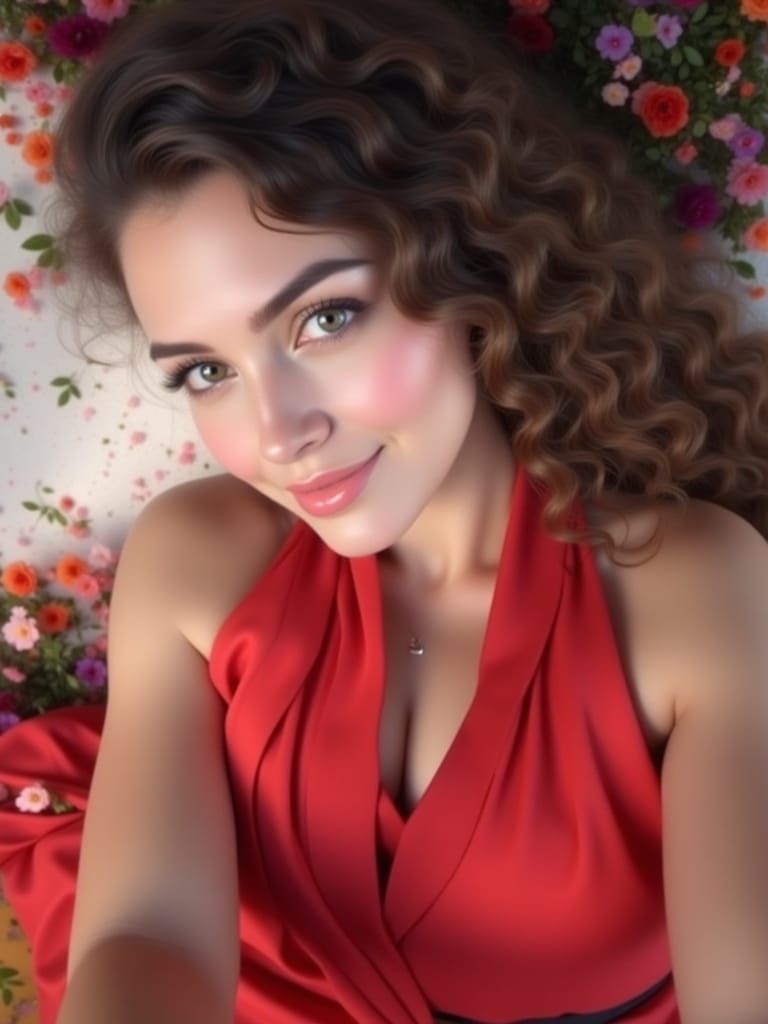 This image depicts a confident, full-figured woman in a sunlit garden, surrounded by blooming flowers. Her curly brown hair cascades down her back, and she wears a vibrant floral dress that accentuates her curves, captured in a style reminiscent of Impressionist masterpieces.