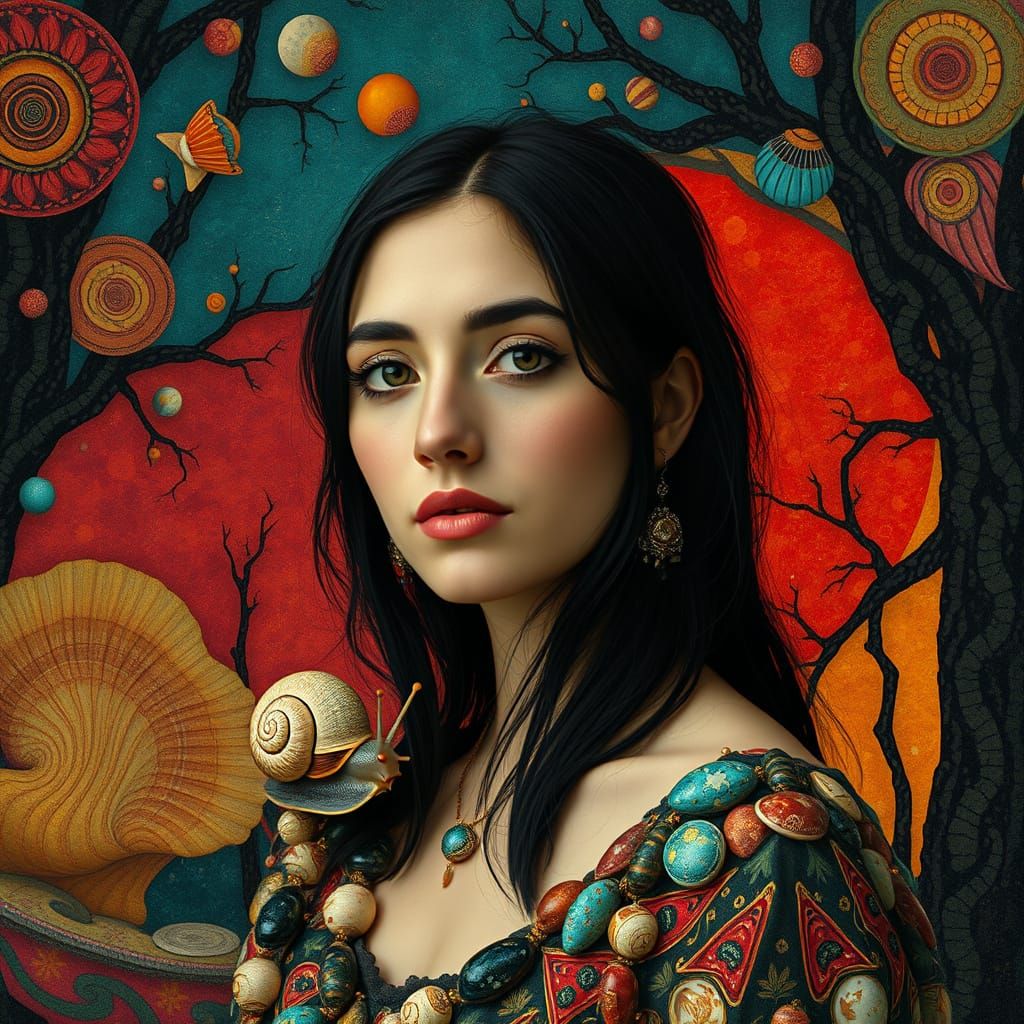 This image shows a woman in a vibrant, colorful setting reminiscent of Klimt and Waterhouse. The artwork combines hyperrealistic and conceptual elements with dramatic lighting, in a double exposure style.
