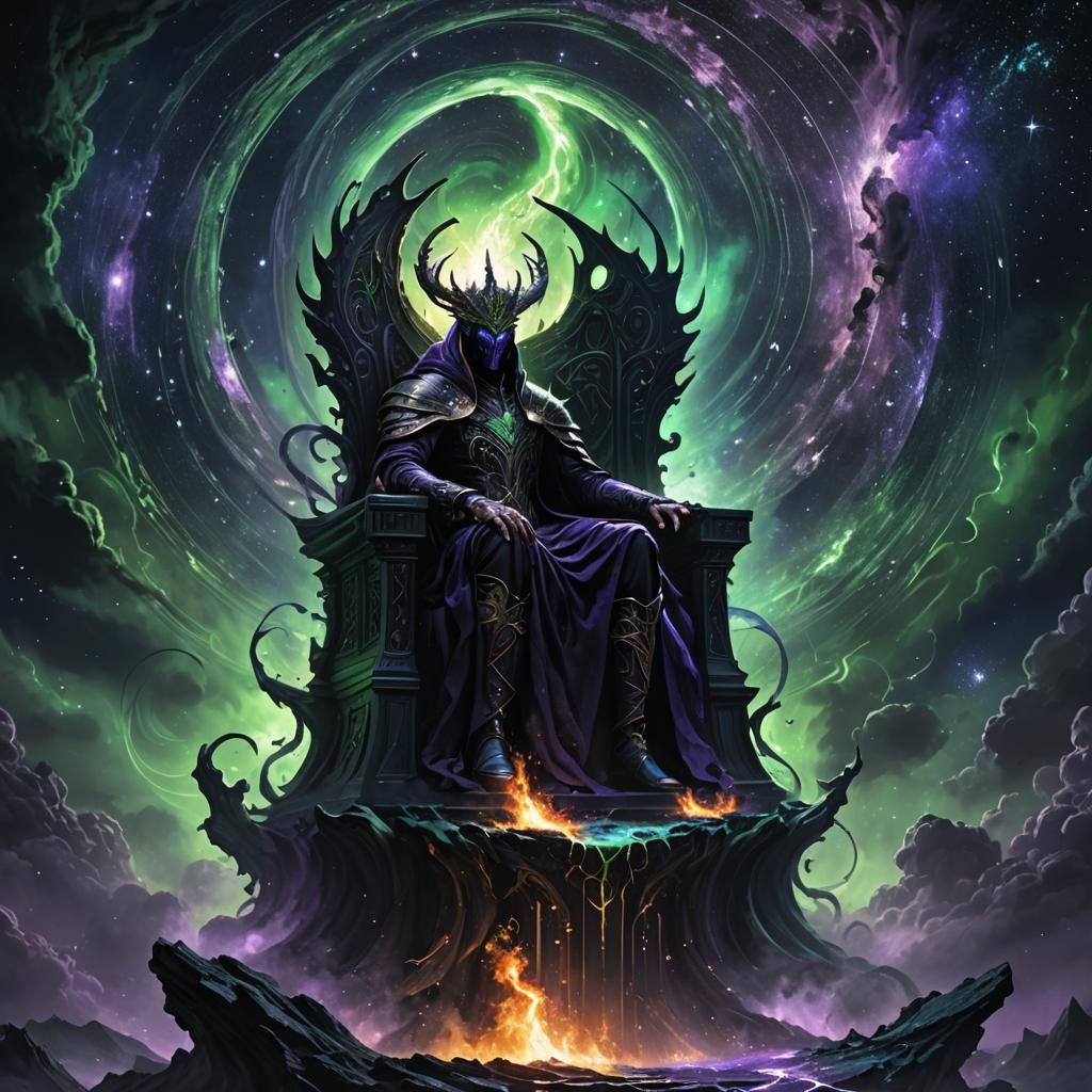 A striking picture of Nyxar, the Void Sovereign, enthroned amidst a swirling vortex under a starry night. Reality tears reveal burning worlds, illuminated by dramatic lighting and intricate runes in a cinematic, fantastical digital painting.