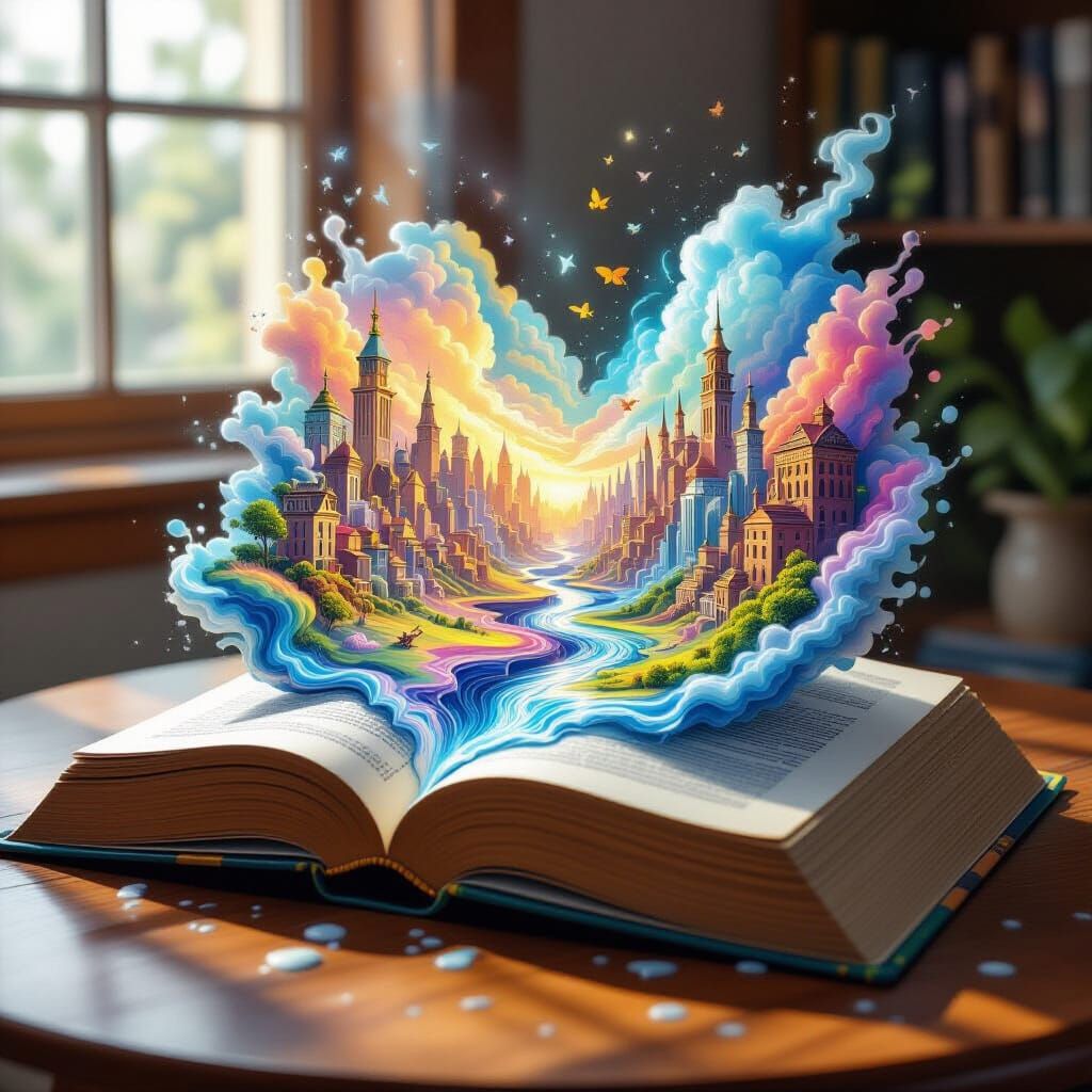 This image shows an open book with pages displaying 3D landscapes and cityscapes that blend into swirling colors. Rendered in a surreal, highly detailed digital painting style.