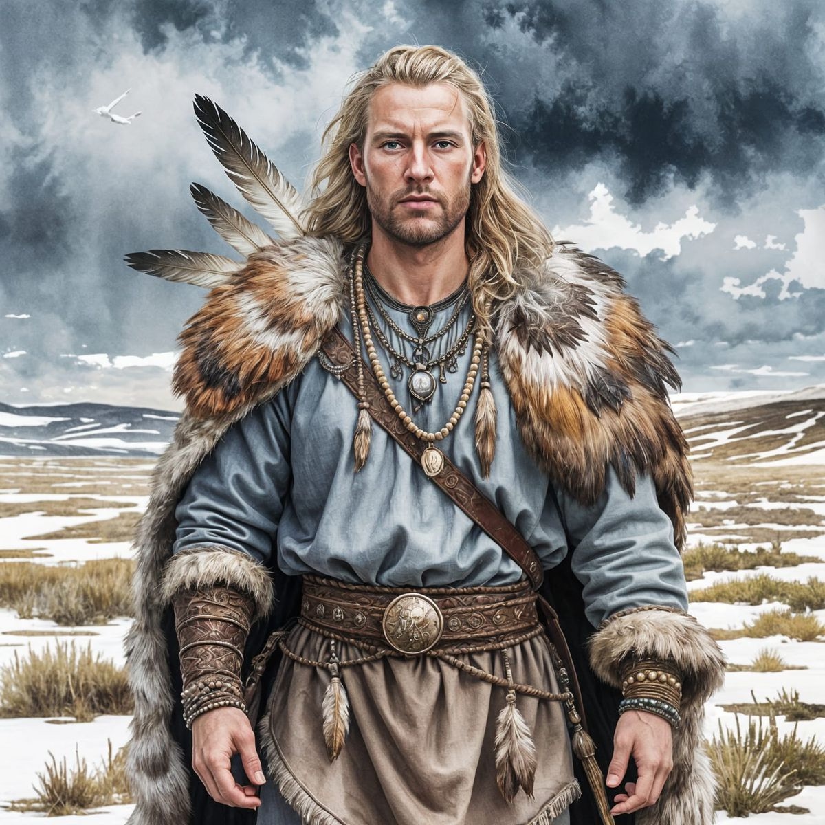 A Swedish Nordic man stands on the tundra, dressed in warm, natural clothing, adorned with feathers, beads, and shells, amidst a gloomy watercolor landscape.