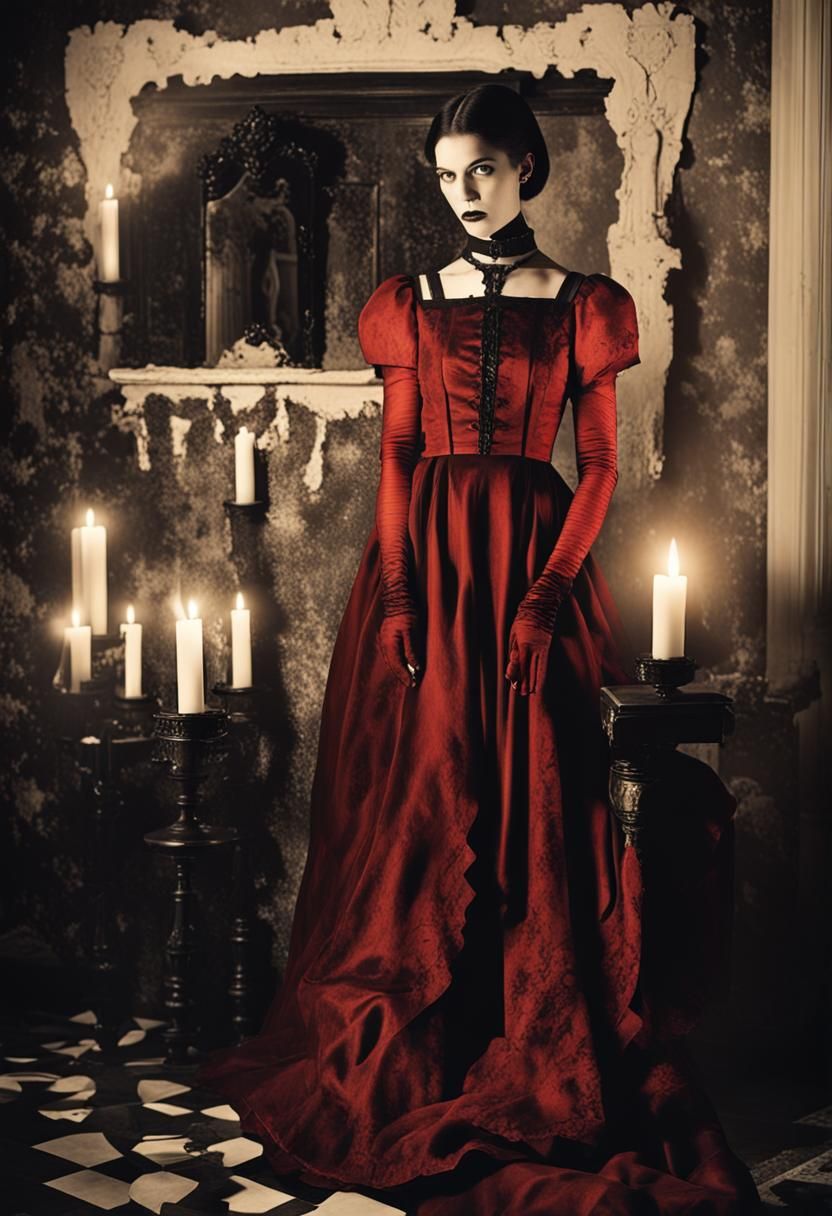 This image shows a goth fashion model in a black and white photograph. The composition is reminiscent of M.C. Escher, with dim, candle-lit lighting and antique mirrors creating evil shadows.