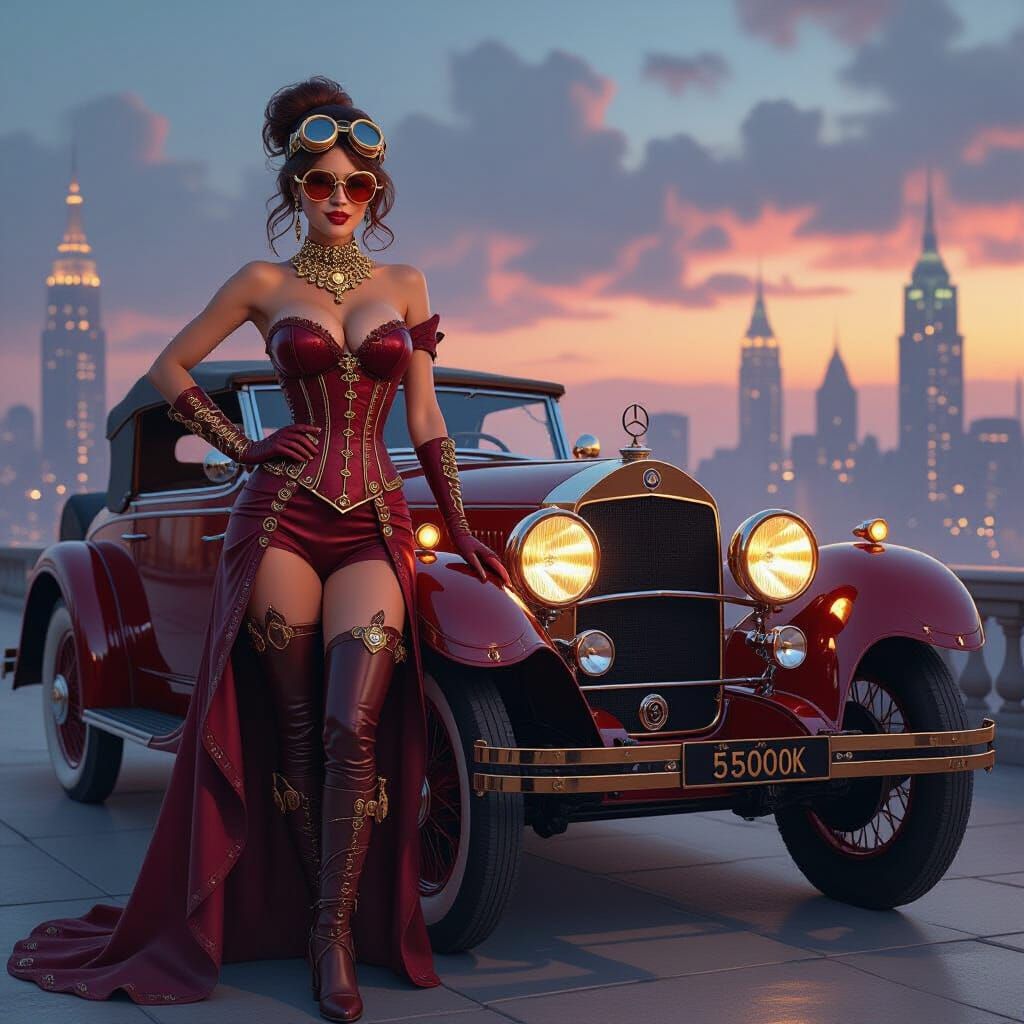 A striking image of a steampunk woman with a golden gearwork necklace standing beside a vintage Mercedes-Benz. The scene is set in a mystical cityscape with electric copper accents, rendered with expressive brushstrokes.