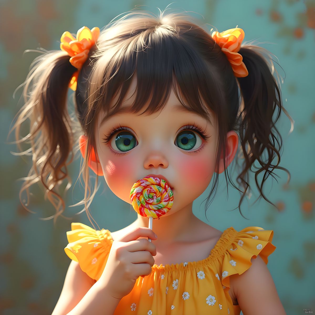 A hyper-realistic portrait of a young girl enjoying a lollipop. The image captures the innocence and sweetness of childhood in stunning detail.