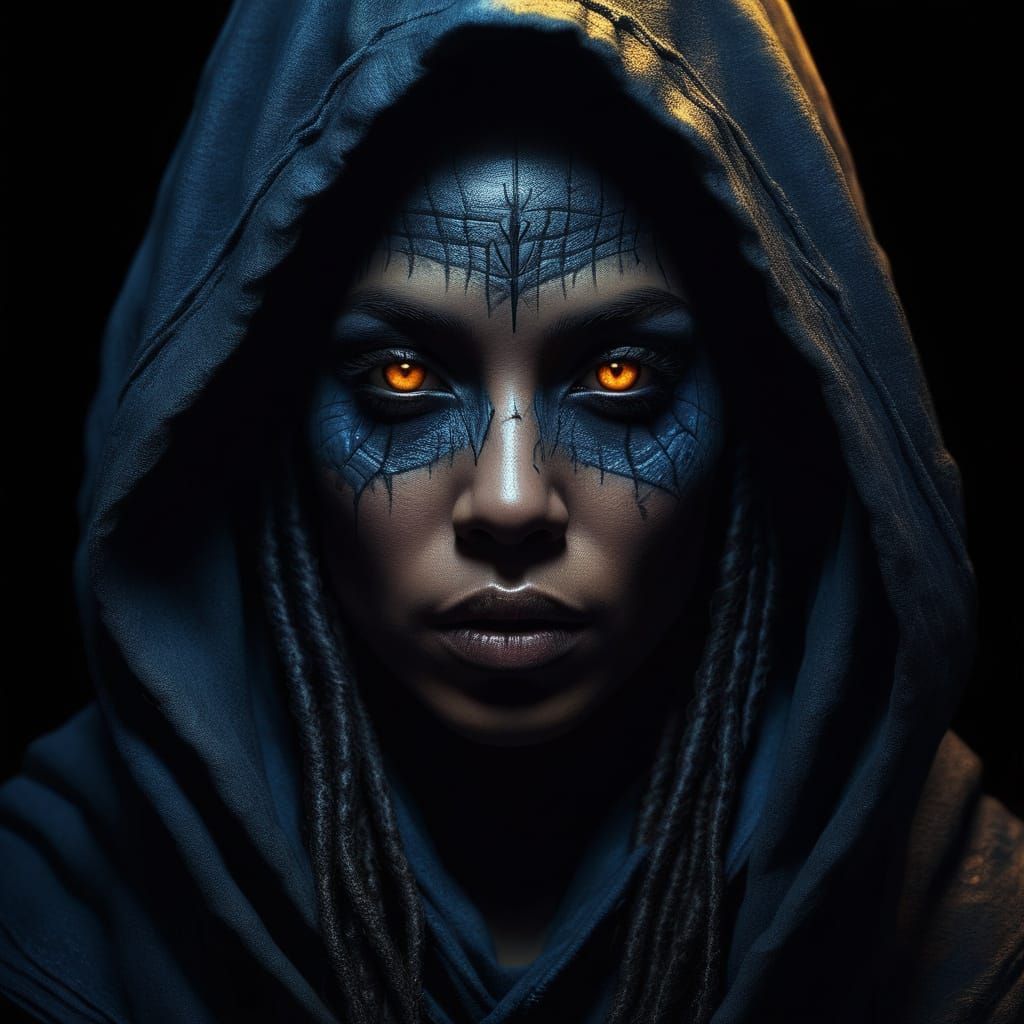 This haunting image depicts a woman's face with dark blue skin, intense yellow eyes, and vibrant, glowing cracks, set against a backdrop of dark shadows and muted colors, evoking a sense of mystery and otherworldly atmosphere.