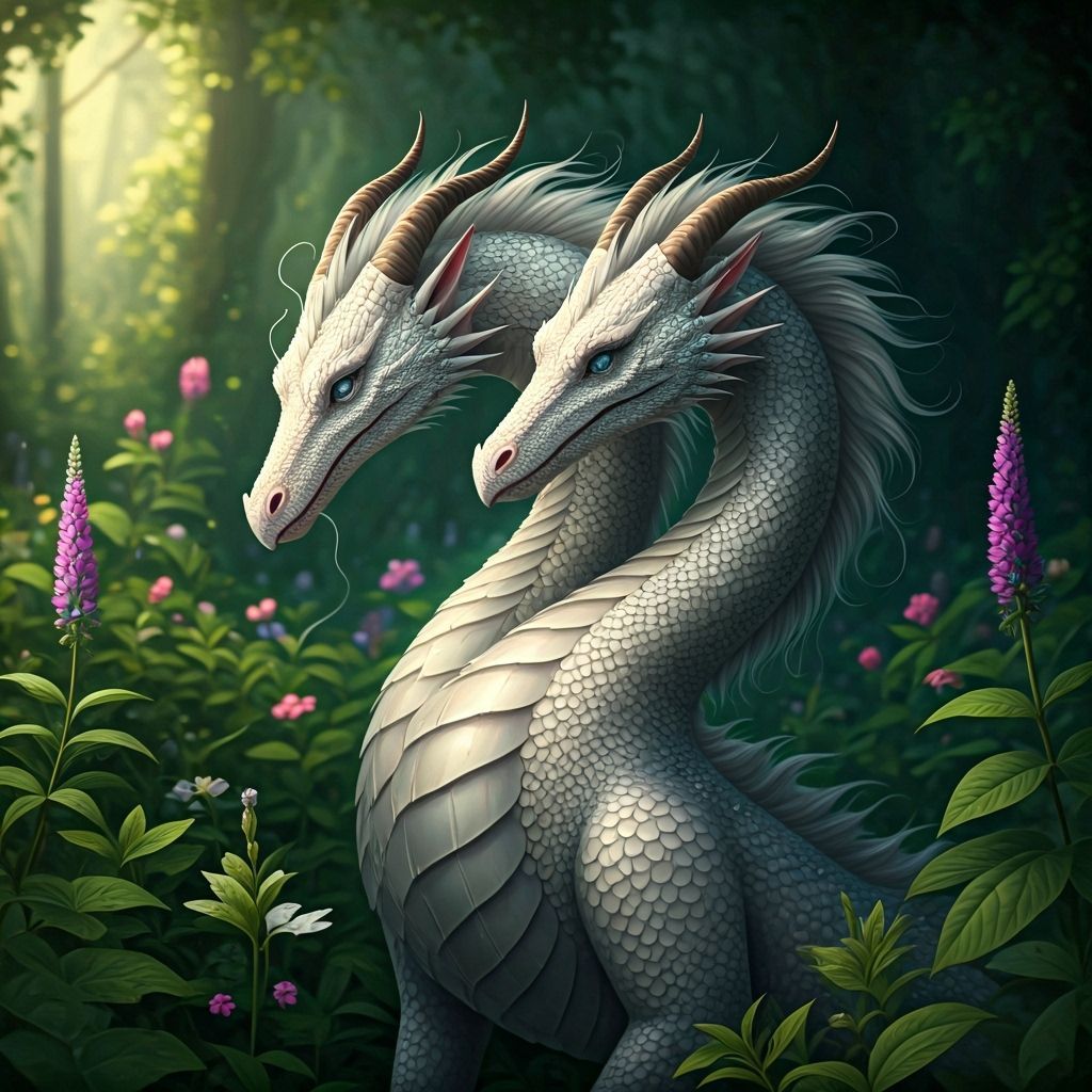 This image shows a beautiful two-headed white dragon in an enchanted forest. The dragon is adorned with silver scales and a flowing mane, set against a backdrop of lush greenery and wildflowers in a dreamy, ethereal style.