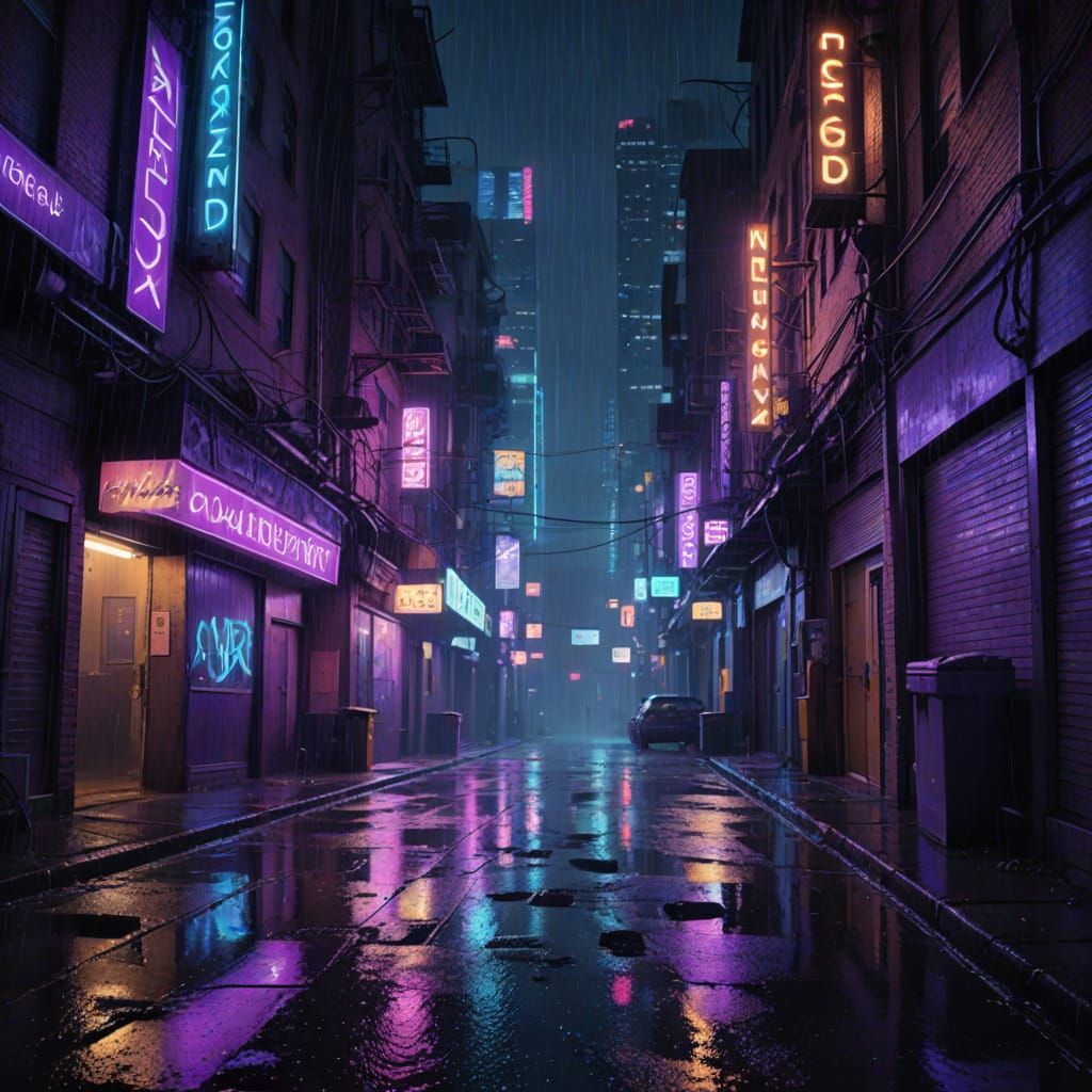 This image depicts a lonely, wet alleyway in a dark, neon-lit city at night. Skyscrapers loom overhead as heavy rain reflects the vibrant, high-contrast glow of signs on the asphalt.