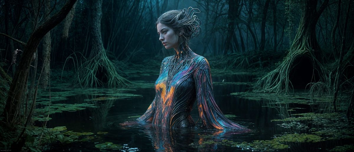 This hyperrealistic dark fantasy image shows an ethereal woman adorned in vibrant, iridescent colors against a mystic marsh. Dramatic, cinematic lighting creates a dreamlike, saturated atmosphere.
